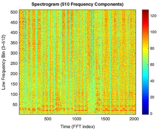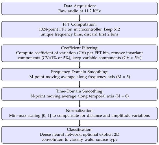 Figure 2 summarizes the data processing pipeline, illustrating the steps from audio signal acquisition to classification of active water sources. After data acquisition, a continuous sequence of 512-point FFTs (Fast Fourier Transforms) is applied to extract the frequency characteristics of the noise captured by the microphone. The first two FFT components—including the DC component—are discarded; the numerical rationale for this choice is discussed in the