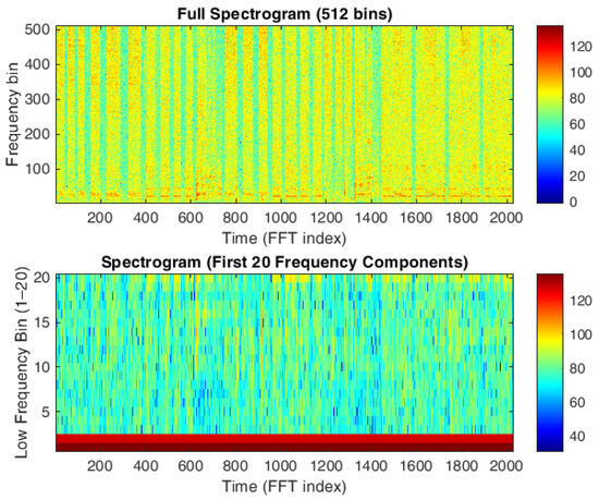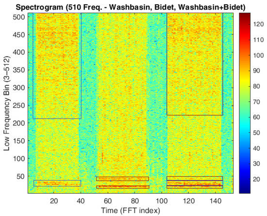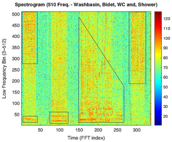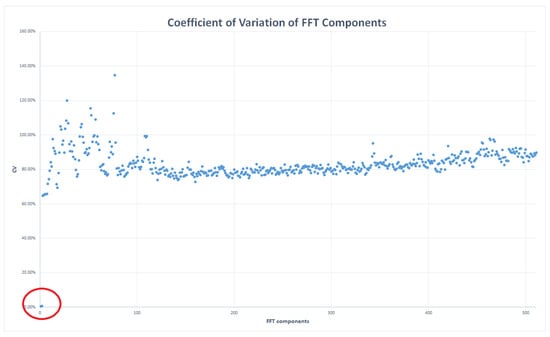From a methodological point of view, all FFT components with a coefficient of variation (CV—the ratio of the standard deviation to the mean) lower than 5%, calculated over the entire set of measurements for each scenario (i.e., same room type and microphone position), can be considered highly stable and invariant under the experimental conditions. As such, their contribution to source identification is essentially negligible. This implies that low-CV components are independent of the environmental conditions, meaning their values remain stable regardless of whether a tap, a shower, or other water sources are used.