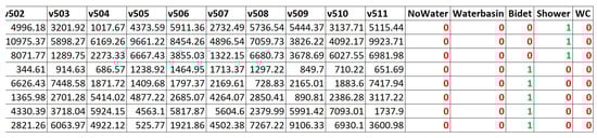 The proposed methodology is general, though the model may require updating through environment-specific data sampling, transformation, and retraining. Training was performed in bathrooms sharing similar characteristics—tiled walls, ceramic fixtures, diffuser filters on water outlets, non-adjustable showerheads of varying diameters, and button-operated toilets producing fast but decaying flows. Bathtubs were not included due to their decreasing prevalence.