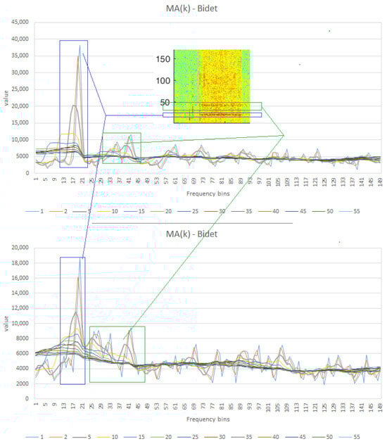 A two-stage filtering process is applied to the selected components. First, an M-point moving average in the frequency domain (M = 5) reduces fluctuations between adjacent frequency bins and enhances robustness to noise. Then, each frequency component, treated as a time series, is smoothed along the temporal axis with an N-point moving average (N = 8), which acts as a low-pass filter and further reduces residual noise.