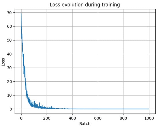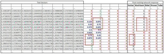 An environment with the bidet and the shower positioned at double distance was also evaluated (noise 0.3). The addition of the environmental noise aims to simulate increased source distance. It should be noted that without adding the environment, the min–max normalization would compensate for the reduction in signal amplitude. In this experiment, the loss reached 5.6375. The environmental component itself is not classified because active sources are present, which is exactly the expected behavior. A total of 89 vectors (4%) failed to recognize the washbasin, 221 vectors (11%) failed to recognize the shower, while 196 vectors (10%) correctly recognized the bidet. The longest burst reached 17 consecutive non-recognitions, while all other bursts were shorter than 8.