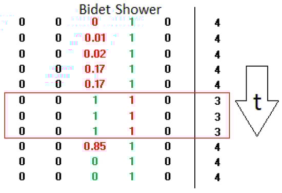Additionally, 446 misclassifications occurred where the model output values were below the decision threshold of 1. Of these, 384 (86%) involved the configuration where all three sources—washbasin, bidet, and shower—were active simultaneously (a class comprising 5498 vectors or 6.9% of the dataset). These misclassifications typically occurred as single-vector spikes (128 ms duration), with the longest erroneous sequence spanning 9 consecutive vectors (just over one second).