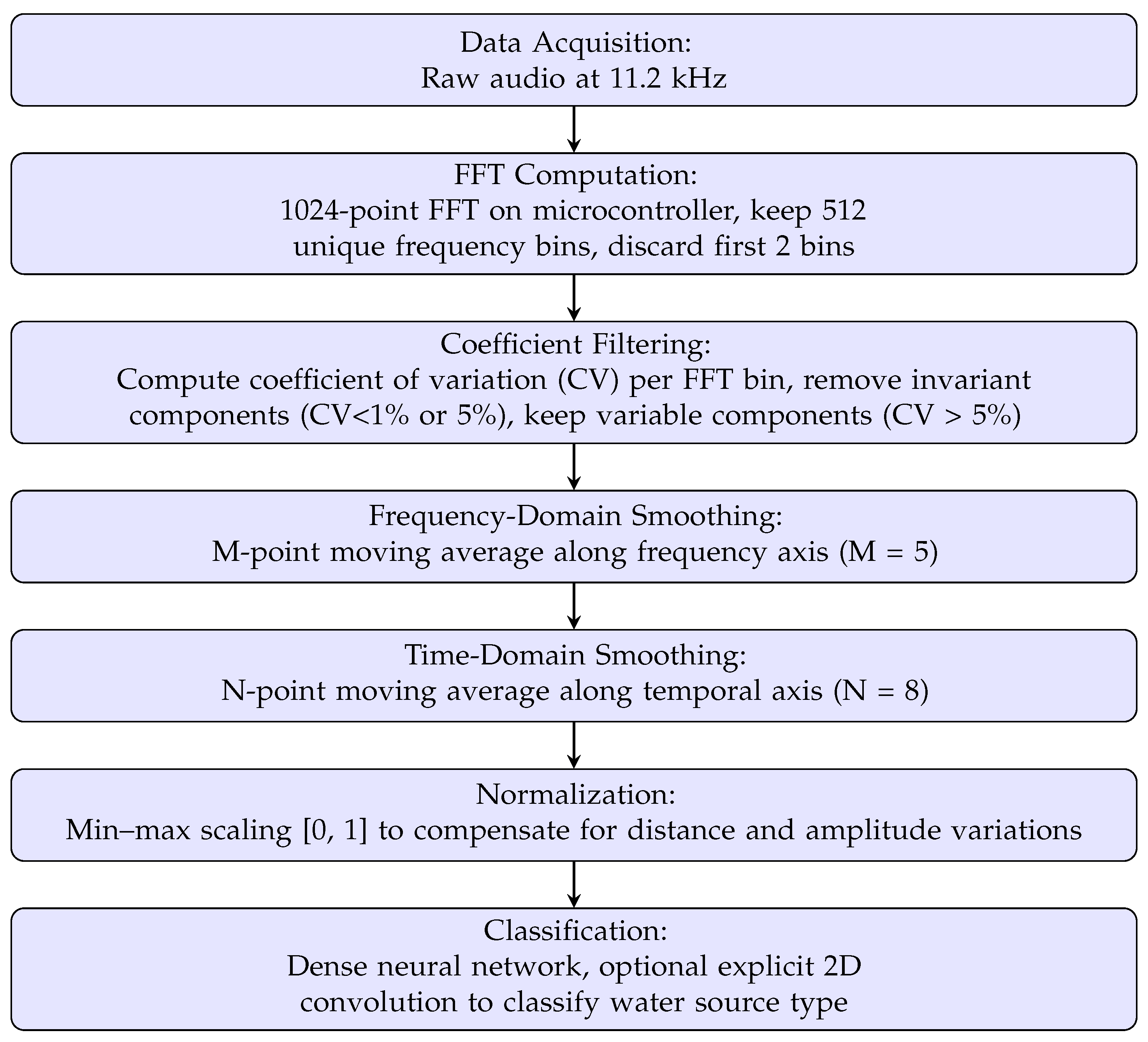 Figure 2 summarizes the data processing pipeline, illustrating the steps from audio signal acquisition to classification of active water sources. After data acquisition, a continuous sequence of 512-point FFTs (Fast Fourier Transforms) is applied to extract the frequency characteristics of the noise captured by the microphone. The first two FFT components—including the DC component—are discarded; the numerical rationale for this choice is discussed in the