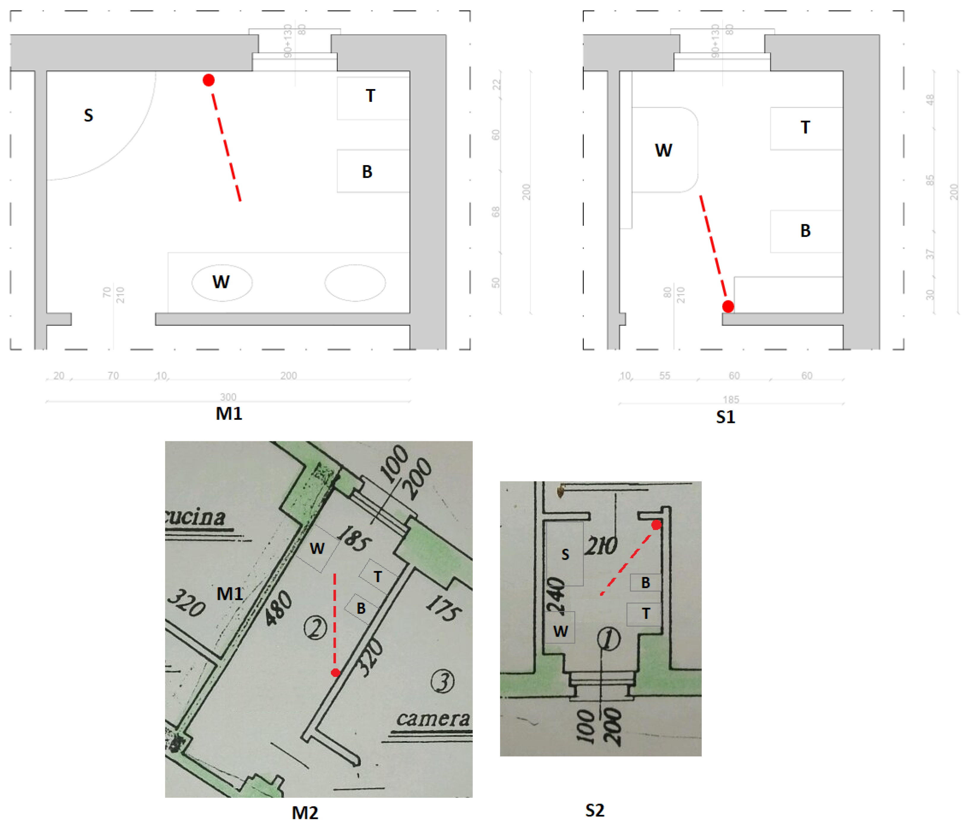 Experiments were conducted in different types of bathrooms in two apartments; in each type, the microphone was placed in a central position, but away from any pipes and specific water usage sources. All fixtures across bathrooms (washbasin, shower tray, bidet) were similar and all made of ceramic. The analyzed WC model was a toilet equipped with a flush tank to release a rapid surge of water when a button is pressed. In the future, we will extend the analysis to other types of elements, such as different types of shower heads and toilet flushing. All the analyzed bathrooms had tiled walls up to approximately 180 cm in height, one glass shower enclosure and one masonry shower enclosure, tiled floors, and a window. The characteristics of the bathrooms are as follows:
