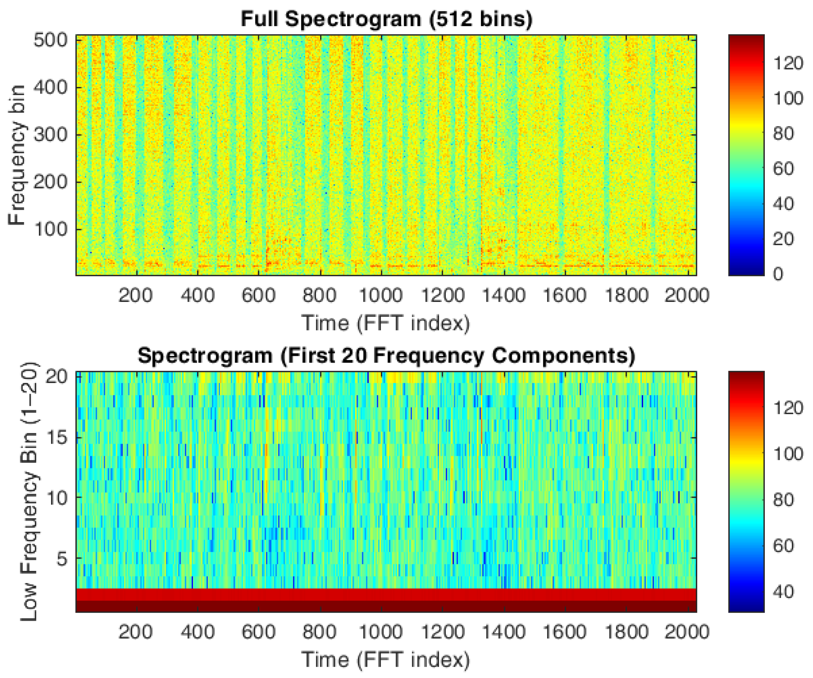 A two-stage filtering process is applied to the selected components. First, an M-point moving average in the frequency domain (M = 5) reduces fluctuations between adjacent frequency bins and enhances robustness to noise. Then, each frequency component, treated as a time series, is smoothed along the temporal axis with an N-point moving average (N = 8), which acts as a low-pass filter and further reduces residual noise.