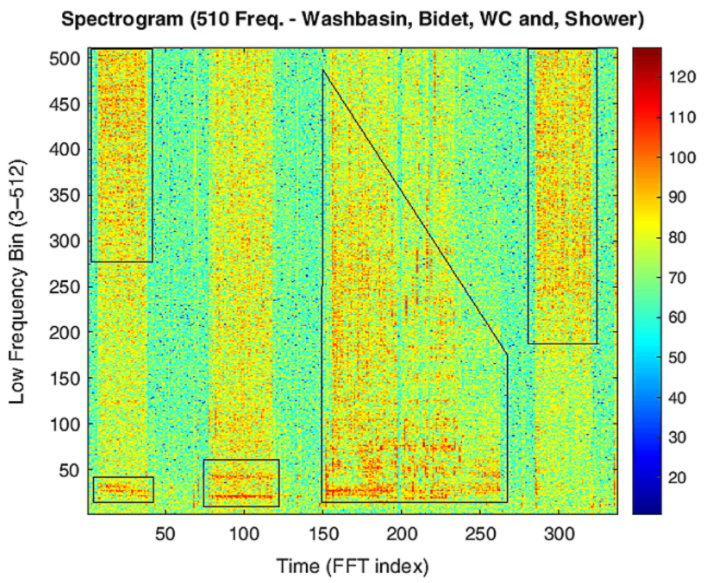The proposed methodology is general, though the model may require updating through environment-specific data sampling, transformation, and retraining. Training was performed in bathrooms sharing similar characteristics—tiled walls, ceramic fixtures, diffuser filters on water outlets, non-adjustable showerheads of varying diameters, and button-operated toilets producing fast but decaying flows. Bathtubs were not included due to their decreasing prevalence.