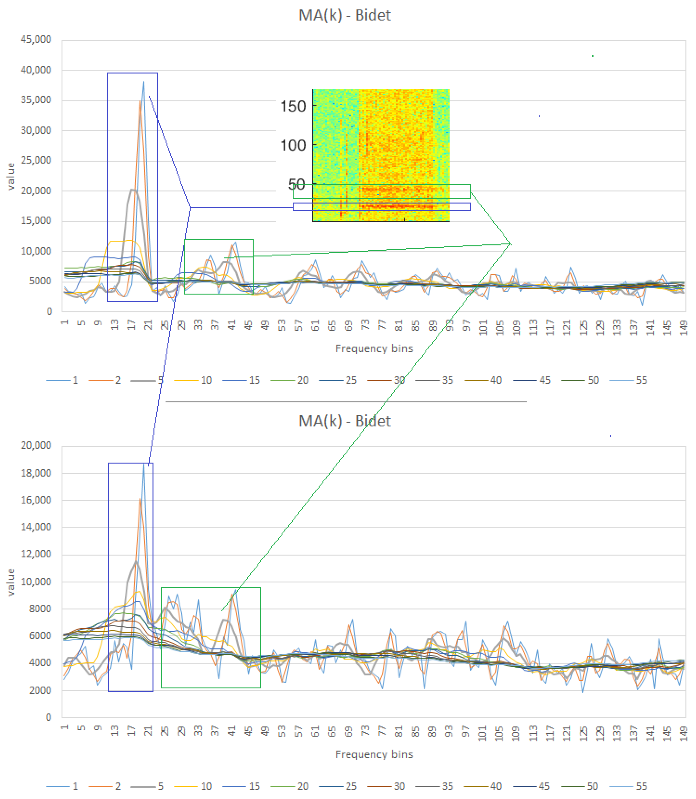 A total of 11,197 synthetic sequences were generated, with the following class distribution: shower (103), washbasin (118), bidet (190), shower + bidet (1745), bidet + washbasin (2692), shower + washbasin (1644), and shower + bidet + washbasin (5505). These classes were concatenated in sequence and processed according to the proposed methodology, including moving average operations in both the frequency and time domains.