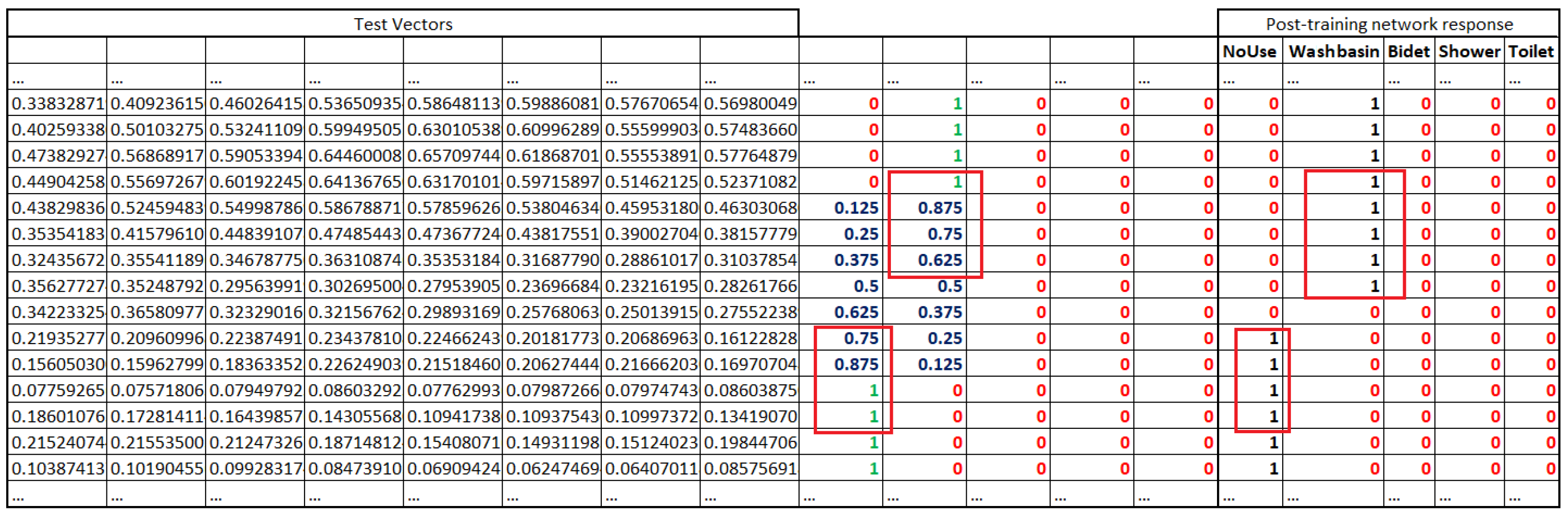 Additionally, 446 misclassifications occurred where the model output values were below the decision threshold of 1. Of these, 384 (86%) involved the configuration where all three sources—washbasin, bidet, and shower—were active simultaneously (a class comprising 5498 vectors or 6.9% of the dataset). These misclassifications typically occurred as single-vector spikes (128 ms duration), with the longest erroneous sequence spanning 9 consecutive vectors (just over one second).