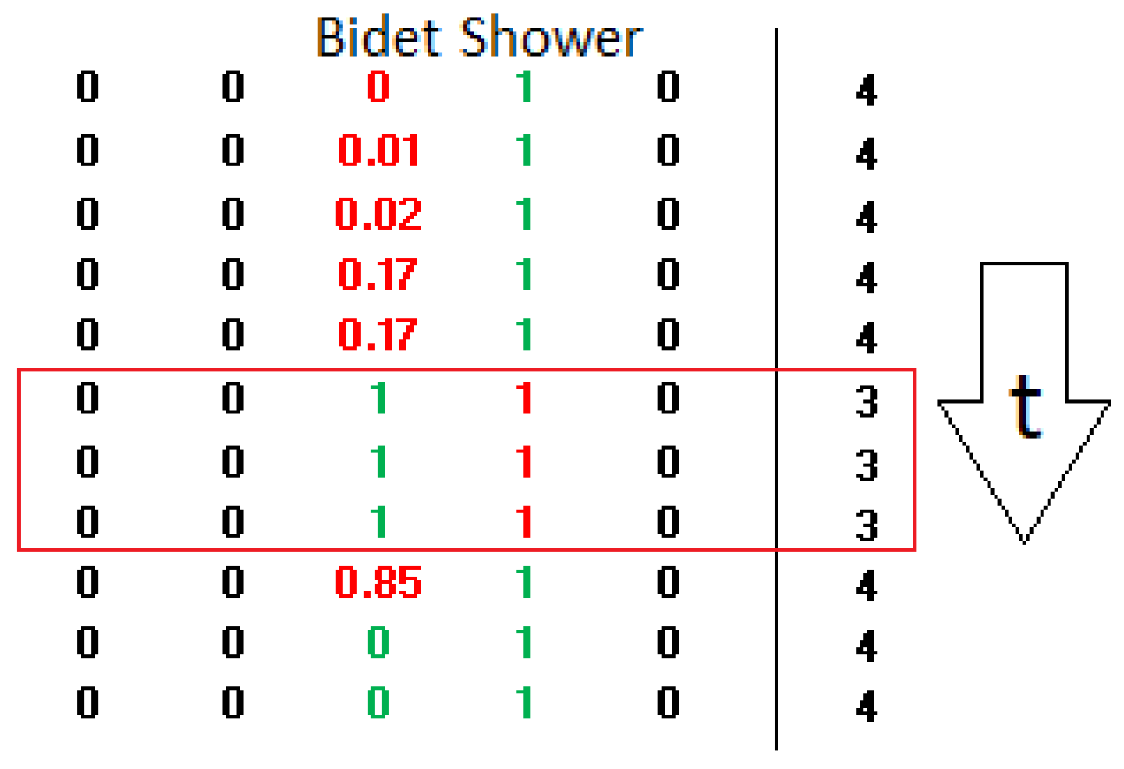 Figure 15, the brief period of indecision—during which the output alternates between bidet and shower—could be consistently resolved in favor of shower, since it is improbable that the water would be turned off and immediately on again within such a short time frame.