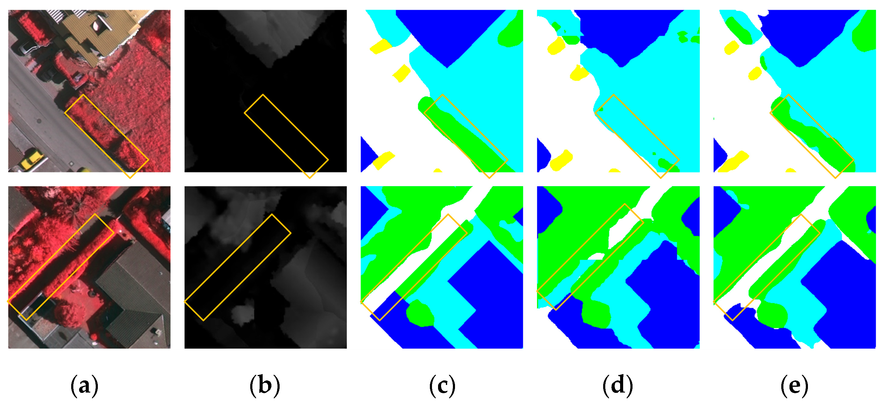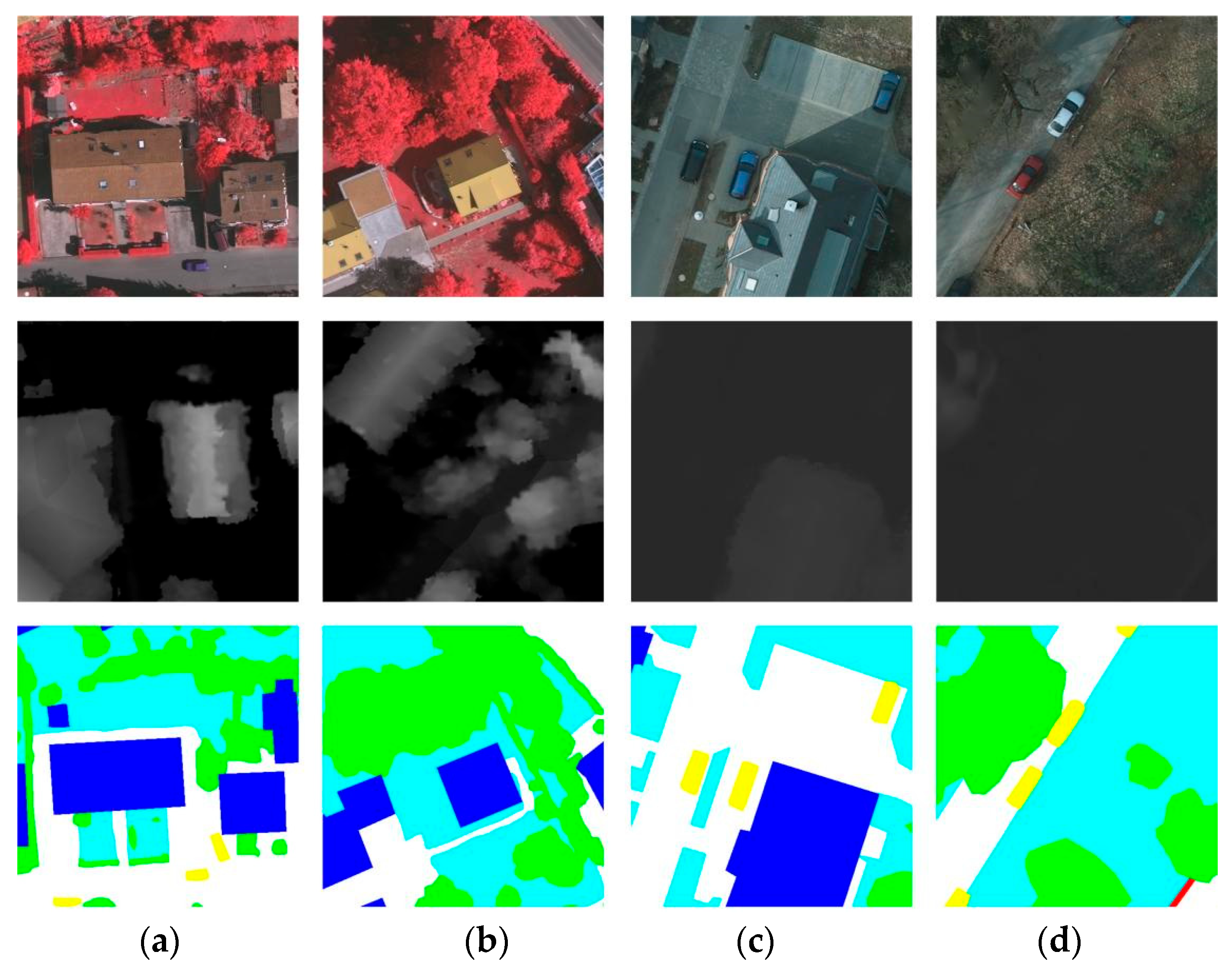 - Cao, Z.; Fu, K.; Lu, X.; Diao, W.; Sun, H.; Yan, M.; Yu, H.; Sun, X. End-to-End DSM Fusion Networks for Semantic Segmentation in High-Resolution Aerial Images. IEEE Geosci. Remote Sens. Lett. 2019, 16, 1766–1770. [Google Scholar] [CrossRef]