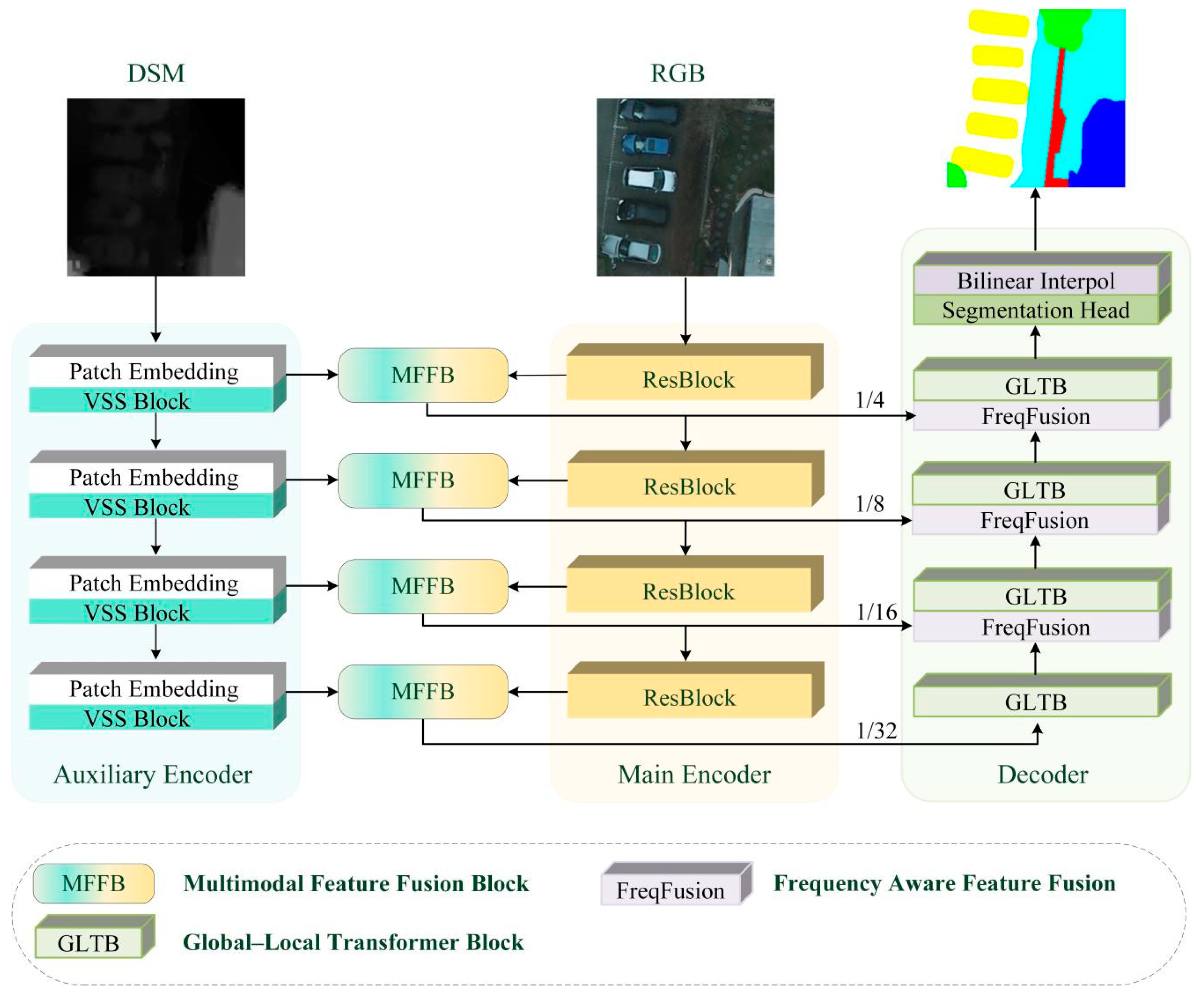 - Ye, F.; Tan, S.; Huang, W.; Xu, X.; Jiang, S. MambaTriNet: A Mamba-Based Tribackbone Multimodal Remote Sensing Image Semantic Segmentation Model. IEEE Geosci. Remote Sens. Lett. 2025, 22, 2503205. [Google Scholar] [CrossRef]