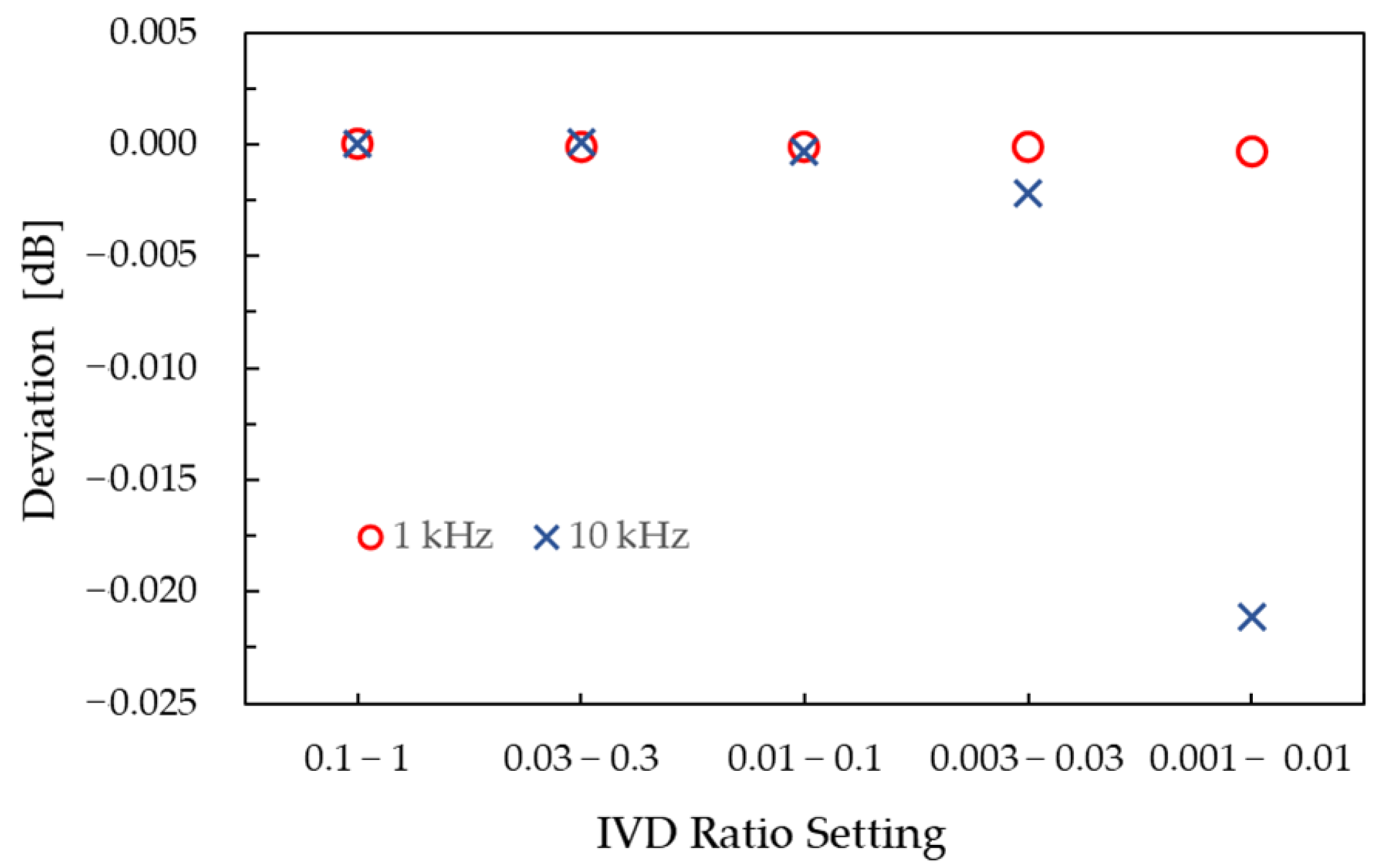 To validate this uncertainty estimation, measurements of a nominal 20 dB step attenuation were performed using five different IVD ratio settings: Si = 0.1 to Sf = 1, 0.03 to 0.3, 0.01 to 0.1, 0.003 to 0.03, and 0.001 to 0.01. By applying these different ratio settings to realize the same attenuation value, the effect of IVD calibration uncertainty can be directly assessed against the theoretical estimates. The results are presented in Figure 3. At 1 kHz (blank circles), the measurements remain stable across all IVD settings, indicating a negligible contribution from the IVD ratio. In contrast, at 10 kHz (crosses), a measurable deviation is observed, particularly for the Si = 0.001 to Sf = 0.01 setting, where the measured difference reaches approximately 2.2 × 10−2 dB. This deviation is consistent with the estimated uncertainty of the IVD at these settings at 10 kHz (Table 1).