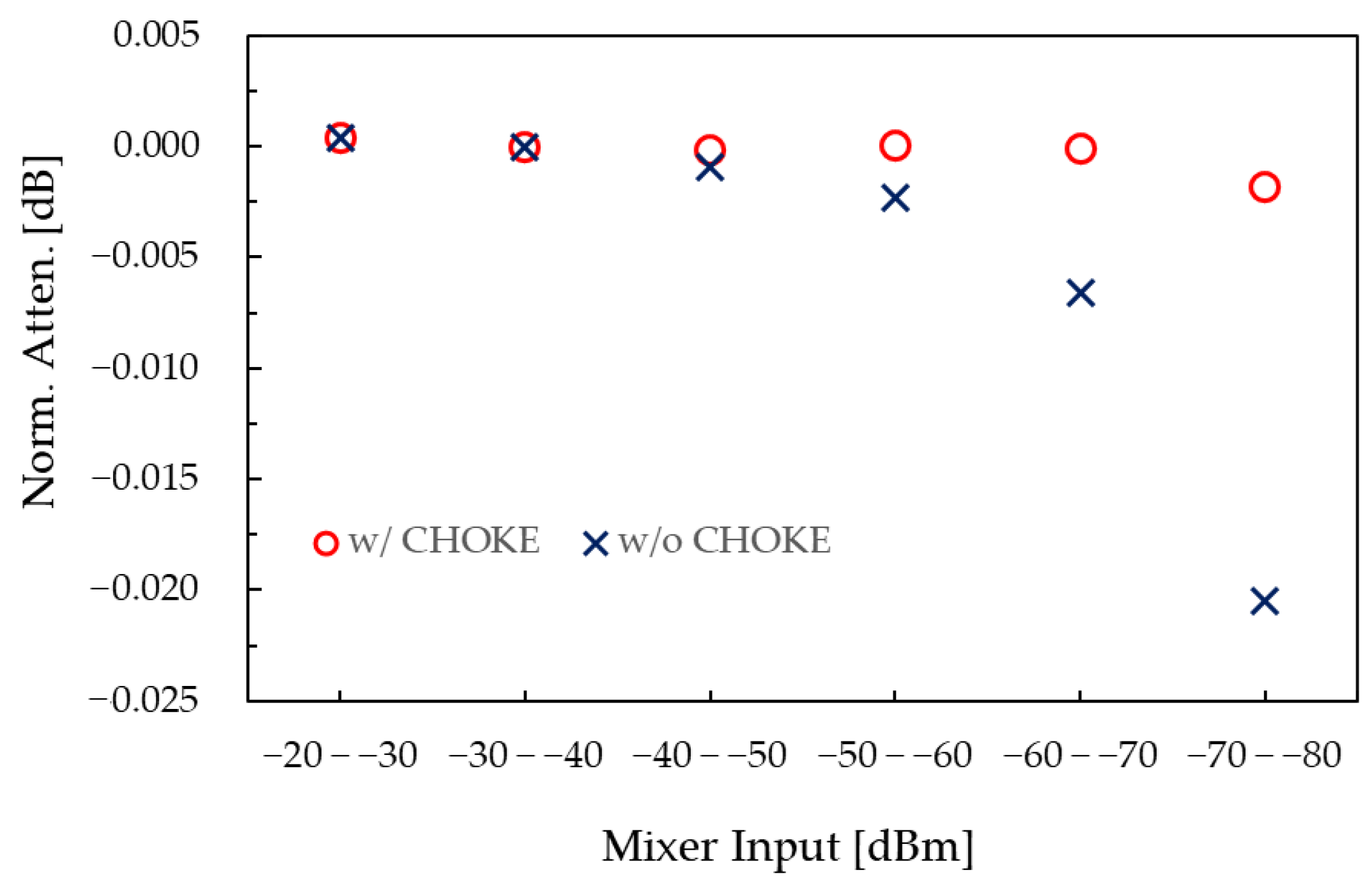 To demonstrate the effectiveness of toroidal ferrite chokes on the system’s test ports in suppressing common-mode currents, linearity measurements were also performed with the toroidal ferrite chokes removed. The results, shown as crosses in Figure 5, reveal noticeable differences starting at a mixer input level of −50 dBm, increasing as the input decreases. At −80 dBm, the difference exceeds 0.02 dB.