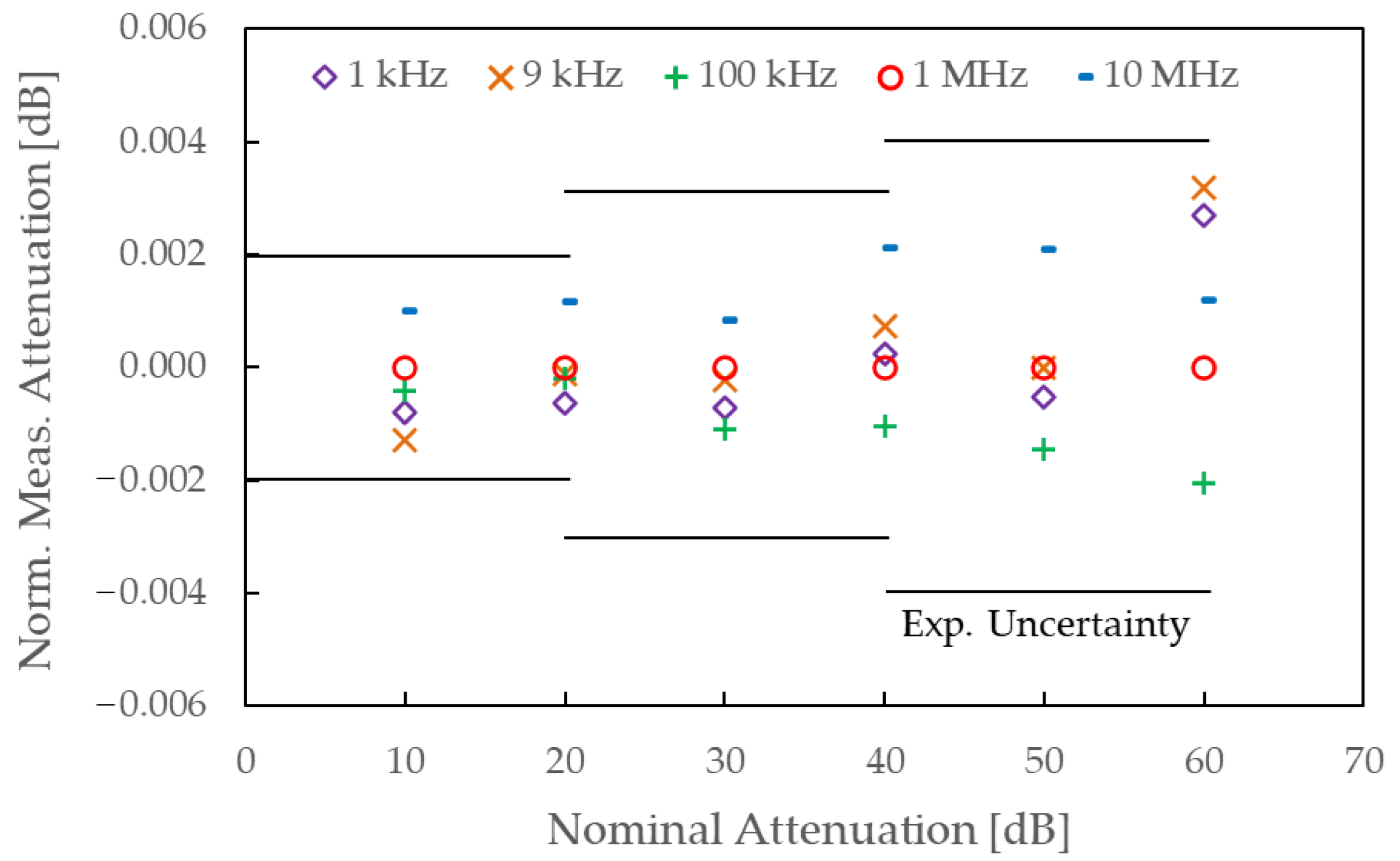 Figure 6 shows the measurement results of the proposed transfer standard at nominal attenuation levels from 10 dB to 60 dB in 10 dB steps. Measurements were conducted at 1 kHz, 9 kHz, 100 kHz, 1 MHz, and 10 MHz. The data were normalized to the 1 MHz results and plotted to assess frequency dependence. As shown, deviations across frequency are minimal, around ±1.0 × 10−3 dB, ±2.0 × 10−3 dB, and ±3.0 × 10−3 dB for the 20 dB, 40 dB, and 60 dB settings, respectively, and remain within the expanded uncertainty limits indicated by the horizontal error bars. These results demonstrate that a single-frequency calibration at 1 MHz is sufficient to characterize the behavior of the step attenuator across the entire 1 kHz to 10 MHz range. Therefore, a working-standard system for attenuation calibration across this frequency range can be effectively implemented by directly comparing the device under test with a reference standard calibrated at a single frequency, i.e., 1 MHz, thereby simplifying the system configuration and eliminating the need for frequency conversion circuitry.