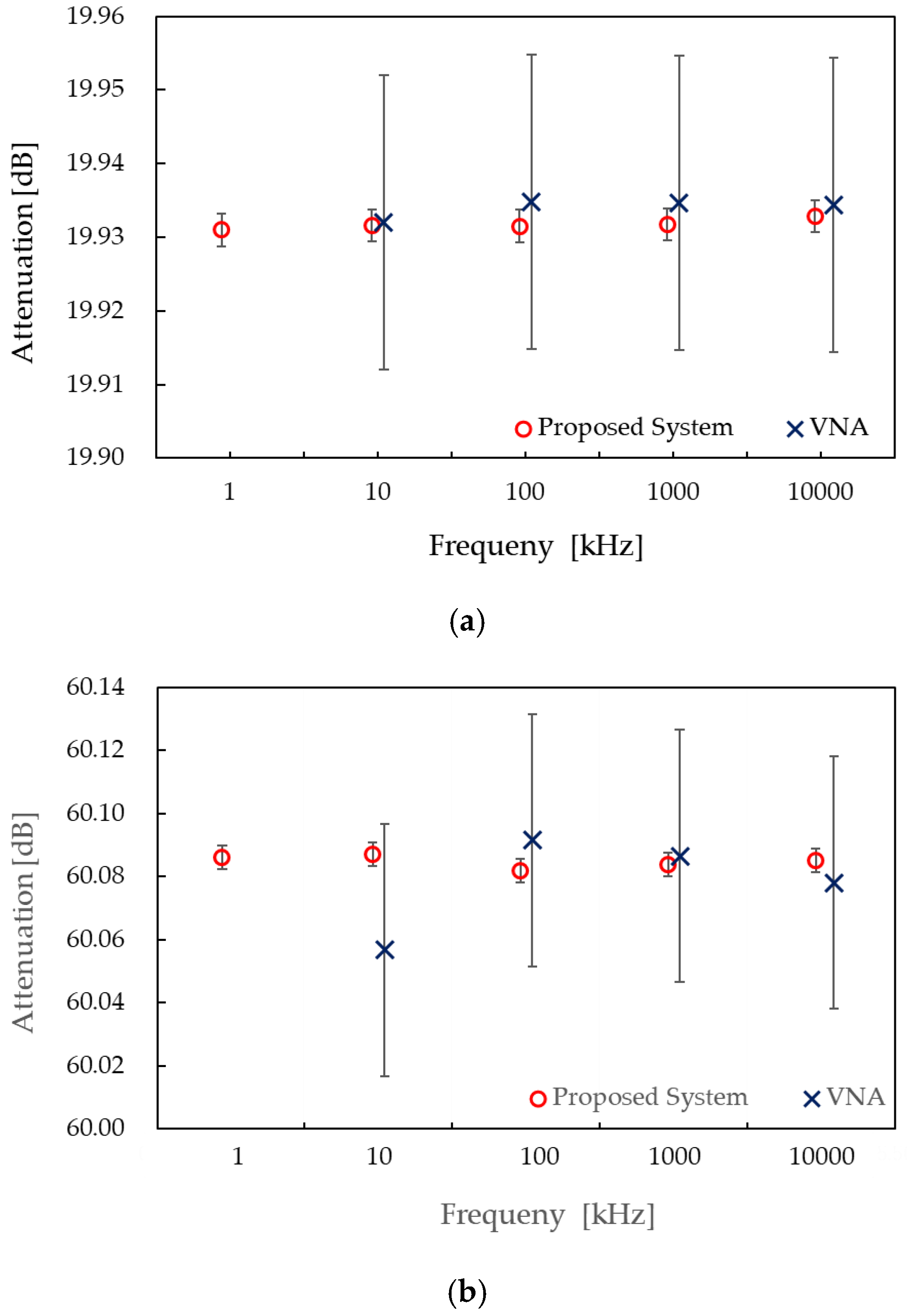 To verify the effectiveness of the proposed measurement system, RF resistive step attenuators (Model 84906L) with nominal values of 20 dB and 60 dB were measured at 1 kHz, 10 kHz, 100 kHz, 1 MHz, and 10 MHz. The results are shown in Figure 7(a),(b), where the circles represent the mean of ten repeated measurements and the vertical error bars indicate the expanded uncertainty as described above. Minimal variation was observed across the frequency range, consistent with the flat frequency response of the RF resistive attenuator within this low-RF range.