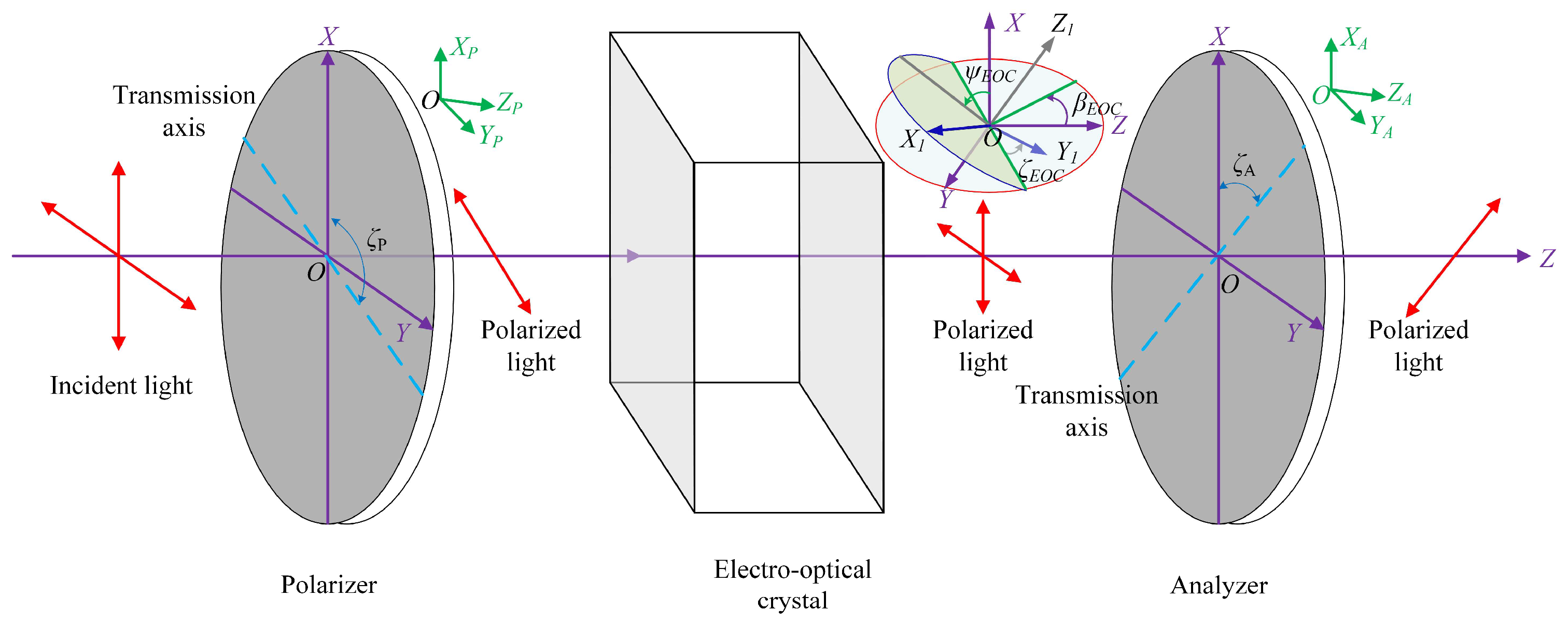 - Azimuthal alignment of the electro-optic crystal: The principal dielectric axes OX1 and OY1 of the electro-optic crystal under zero-voltage conditions are precisely aligned with the OX-axis and OY-axis of the optical system, achieving a rotation alignment angle of ζEOC = 0°.