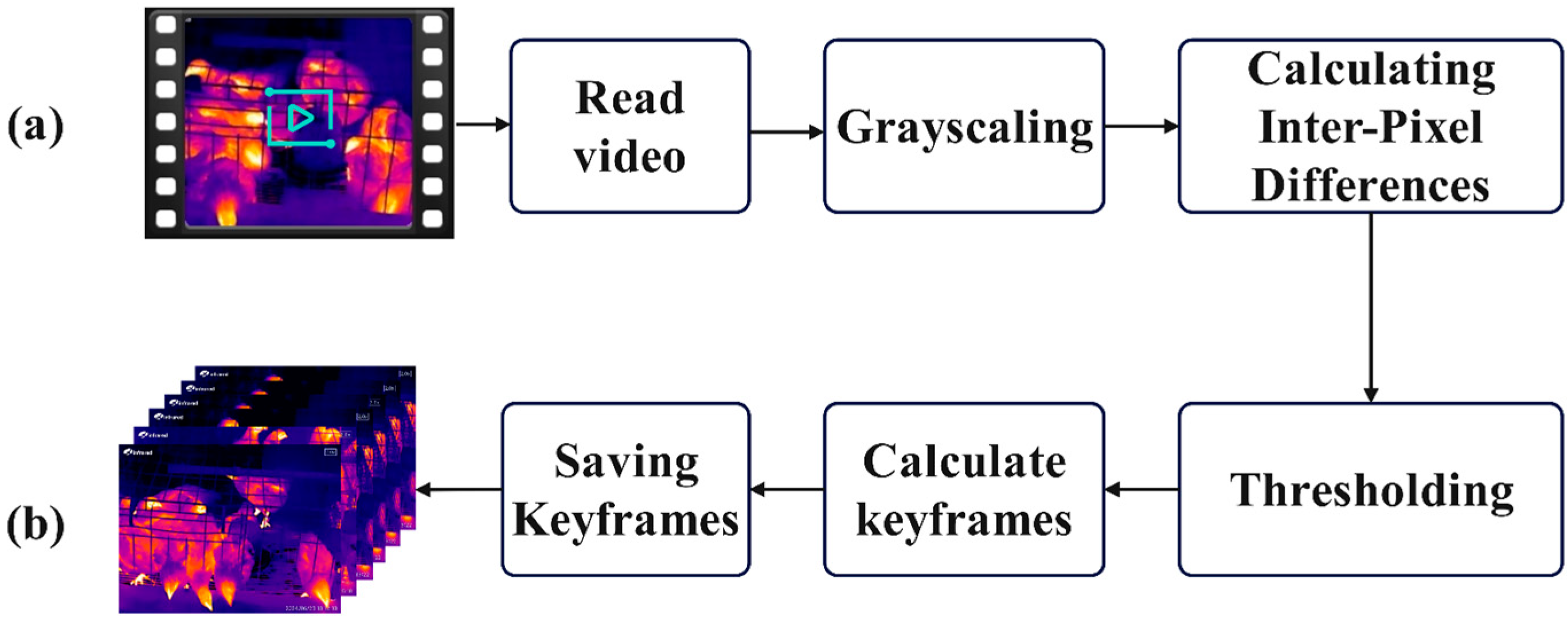 The thermal imaging video data of chickens cannot be directly utilized for model operation and requires further processing to convert it into image data suitable for model training. The video data consists of 25 frames per second, exhibiting minimal differences between adjacent frames. The motion states and distribution of the chicken flock in the processed image data must be unique and significantly distinct from other images. Therefore, it is essential to perform key frame extraction from the video to select appropriate images. To extract key frames from thermal imaging videos using the inter-frame difference method, the video images are first converted into grayscale images to reduce computational complexity. Subsequently, a difference operation is performed on the corresponding pixel points of two adjacent frames or multiple consecutive frames to calculate the absolute difference in grayscale values and obtain the average difference. The differenced images are then thresholded by setting a threshold T, marking the pixel points in the differenced images that exceed this threshold as key frames, as illustrated in