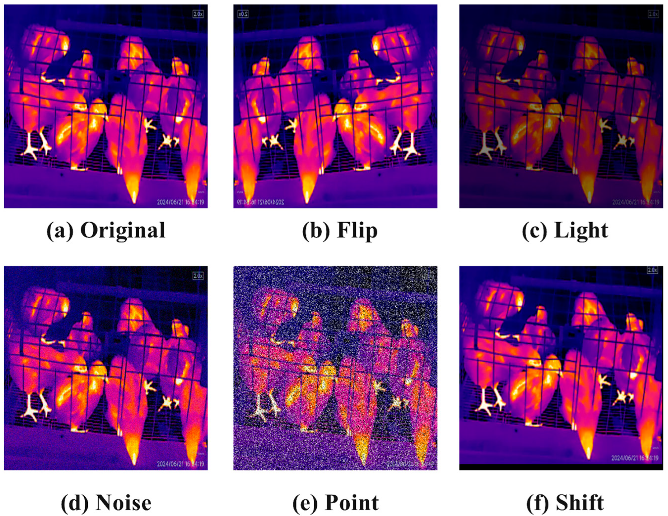 8]. However, many studies have primarily achieved the detection and segmentation of chickens using visible light images. In actual poultry farms, environmental dust and inadequate lighting conditions significantly impede the acquisition of high-quality images, complicating the process of obtaining usable data.