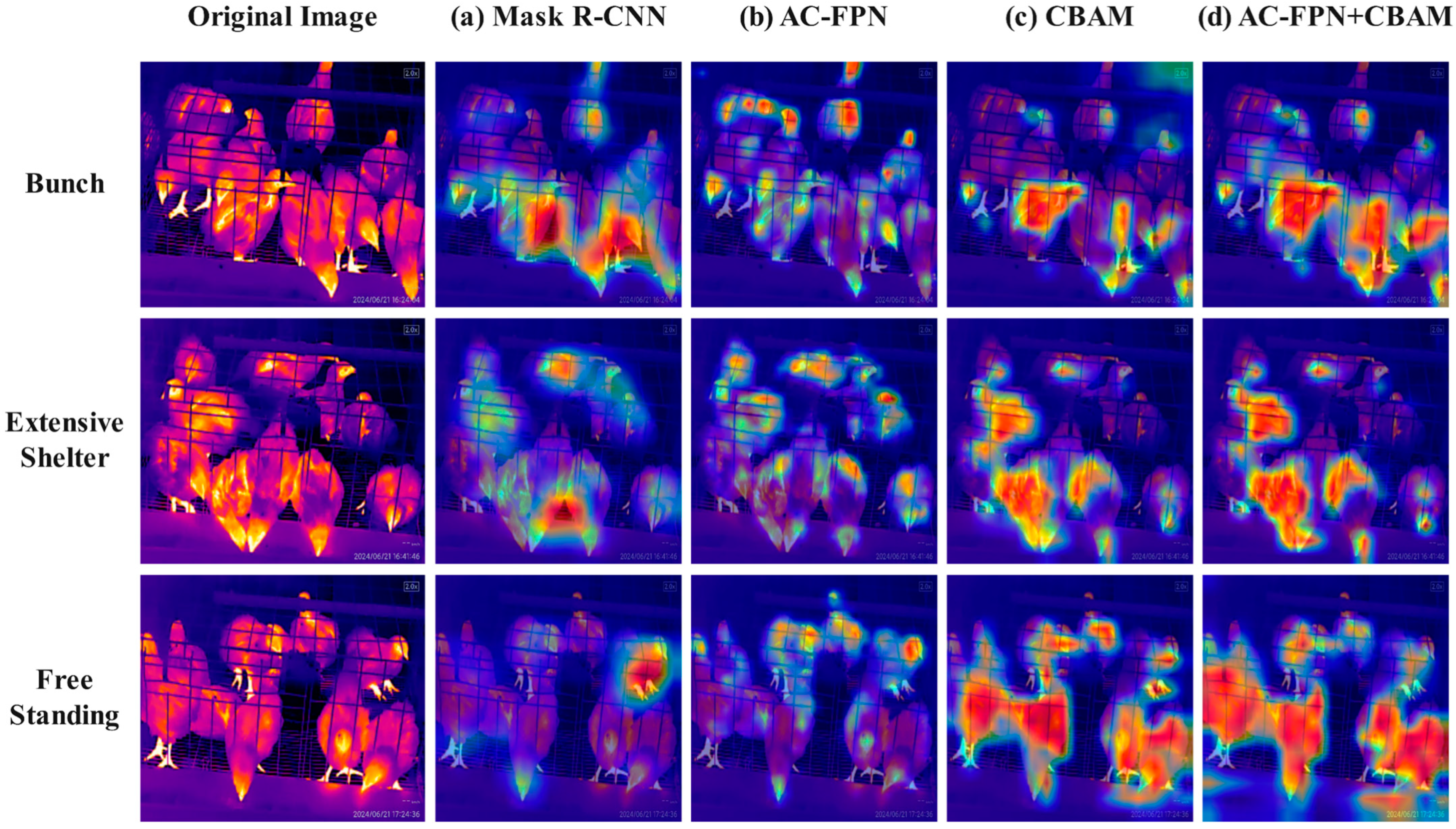 Figure 10. Each colored point on the heatmap corresponds to a specific numerical value. The color gradient, transitioning from blue to red, indicates an increase in value from low to high. This gradient represents the progression of attention weights and activation levels, where red signifies high attention weights and activation levels. The original Mask R-CNN model with the ResNet-101 backbone exhibited activation in low-level feature areas, such as object edges, particularly in the floor and blank areas where chickens with specific temperatures had been located, failing to effectively focus on the chickens themselves. In contrast, the model with AC-FPN demonstrated high activation areas primarily on the chicken body parts, especially the head. The improved model exhibited a broader field of view and was better able to concentrate on the chicken body parts.