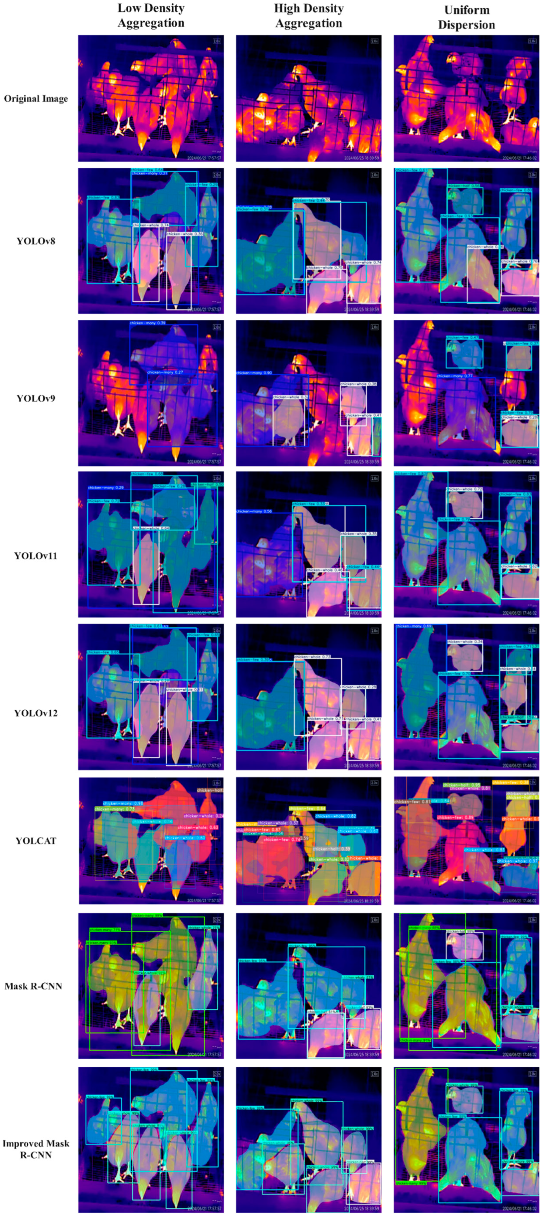 Although YOLOv11 and YOLOv12 represent the most advanced iterations of the YOLO series, the YOLO model functions as a single-stage detector. It processes the input image through a complex convolutional neural network (CNN) in a single pass, directly predicting the coordinates of bounding boxes, confidence scores, and class probabilities for each grid cell in the feature map. In contrast, the improved Mask R-CNN operates as a two-stage detector. In the first stage, the Region Proposal Network systematically scans the entire image, rapidly generating thousands of candidate regions that may contain objects, with these candidate boxes encompassing a broad range. In the second stage, fixed-size features are extracted from the backbone network’s feature map for each candidate region via the RoIAlign operation. These features are then processed through two parallel branches: the classification branch and the bounding box regression branch, which enhances segmentation precision compared to the YOLO series. Additionally, based on experimental results, the architecture of YOLCAT demonstrates suboptimal performance in the detection and segmentation tasks involving densely clustered caged chickens, yielding low metric scores; thus, it is deemed unsuitable for this application.