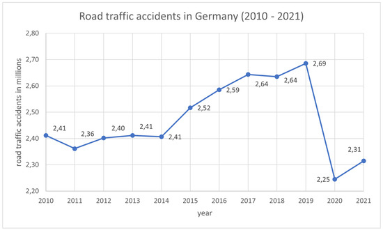 Annual development of road traffic accidents in Germany from 2010 to 2021 [1].