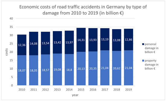 Accidents caused by driver fatigue exhibit a higher fatality rate and result in more severe damage to the surrounding environment compared to accidents involving alert drivers [3,4]. Figure 2 illustrates that the economic costs of road traffic accidents in Germany totalled EUR 33.90 billion in 2019, of which EUR 12.86 billion were attributable to personal injuries. For comparison, the costs of personal injuries in 2010 amounted to EUR 12.36 billion [1]. Continuous monitoring of the driver’s physiological and cognitive state has the potential to mitigate the number of road traffic accidents.