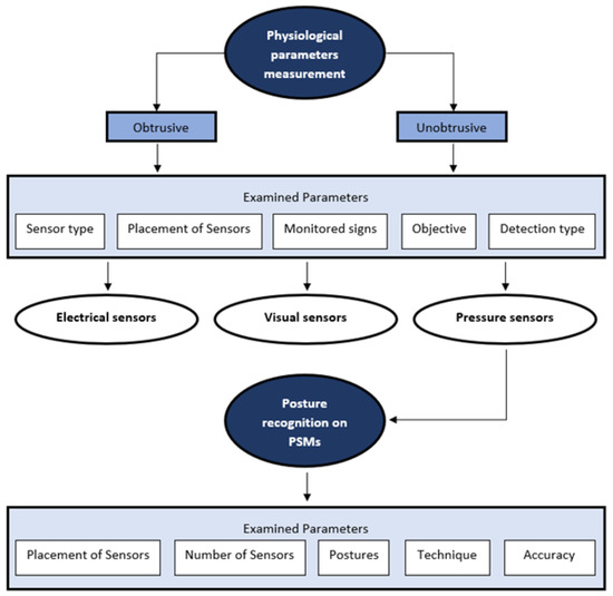 This paper is structured as illustrated in Figure 3. We begin by presenting methods for measuring physiological parameters, distinguishing between obtrusive and unobtrusive approaches. The findings are summarized in Table 1, which details the sensor type, sensor placement, monitored parameters, study objectives, and detection methods, organized by sensor category: electronic sensors first, followed by vision-based sensors, and finally pressure sensors. Subsequently, the focus shifts to posture recognition using PSMs. The corresponding results are presented in Table 2, providing a detailed analysis of sensor placement, number of sensors, recognised postures, classification techniques, and achieved accuracies.