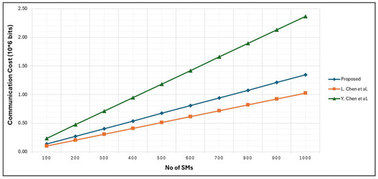 In the FESDAO scheme security parameter is considered as 512 bits, and the size of the ciphertext is 1024 bits. For source authentication, HMAC with SHA-256 is employed, producing a 256-bit tag. To mitigate replay attacks, a 32-bit timestamp and a 32-bit SM identification number are included. Consequently, the total communication cost for a single SM is calculated as: 1024 bits (ciphertext) + 256 bits (MAC) + 32 bits (timestamp) + 32 bits (ID) = 1344 bits. For all N SMs, the aggregate upstream communication cost is therefore 1344 × N bits. In contrast, the communication cost in scheme [2] is reported as 1024 bits, as the authors only consider the ciphertext size and omit authentication and timestamp overheads. The communication cost of [12] from SM to FN is 3268 bits, and FN to CCC it is also 2368 bits. For Pailler system, the bit length of is considered as 1024 bits, and as 2048 bits. For signature generation SHA-256 is used. Timestamp value of 32 bit along with the 32 bits identification number of SM is added to make a complete packet of 2368 bits. However, at FN, the communication cost varies across all three schemes. The FESDAO scheme adjusts metering data to reflect aggregated values for failed meters, while in schemes [2,12], it is ignored. Figure 9 represents communication cost from SM to FN.