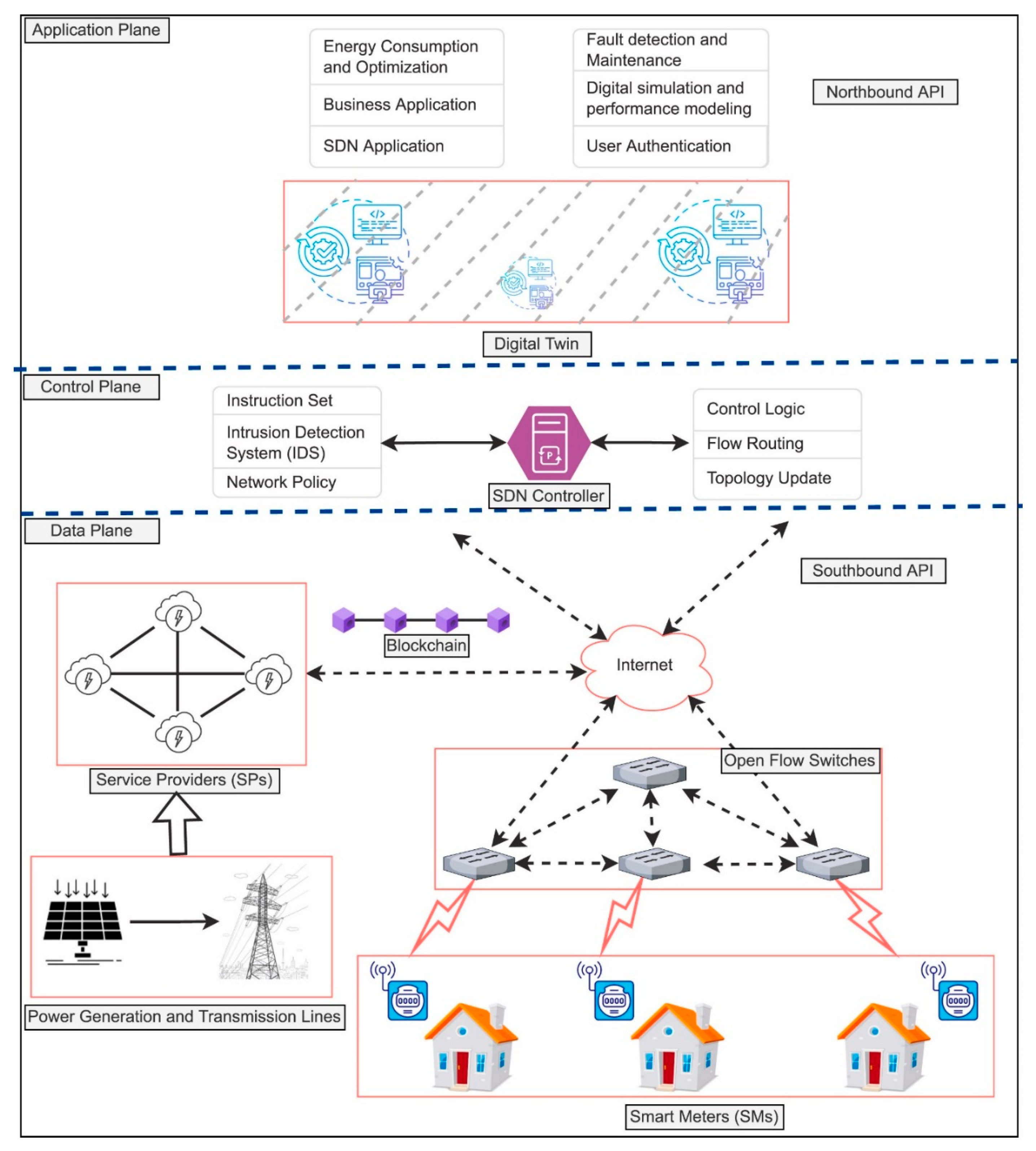 Figure 1 shows the architecture of a Software-Defined Networking (SDN)-based DT for smart energy systems, where the application plane handles optimization and fault detection, the control plane manages flow routing and intrusion detection, and the data plane integrates blockchain, service providers, smart meters, and power generation assets. This layered design demonstrates how the SDN controller coordinates DT operations, ensuring secure and efficient communication across the energy network.