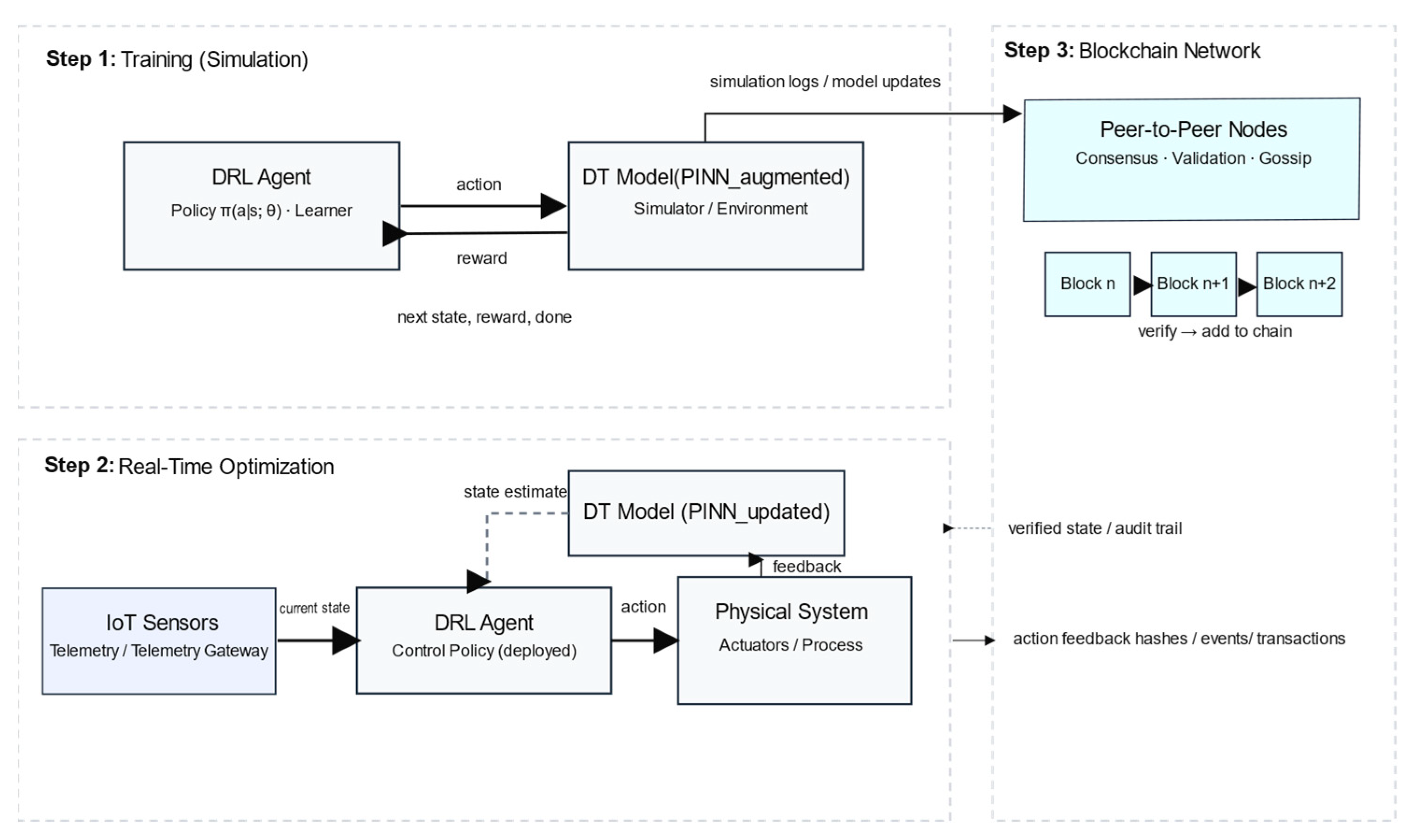 Figure 4 shows that the proposed Hybrid PINNs–DT–DRL–blockchain framework operates in three main steps. Step 1: Training (Simulation): The DRL agent with policy (a∣s) learns by interacting with the PINN-augmented DT model, receiving next states and rewards. Simulation logs and model updates are stored on the blockchain. Step 2: Real-Time Optimization: IoT sensors provide current states to the deployed DRL agent, which generates control actions for the physical system. The DT model is continuously updated with feedback, while the blockchain records verified states, audit trails, and energy-related transactions. Step 3: Blockchain Network: Peer-to-peer nodes validate and append records to the distributed ledger via consensus, thereby ensuring transparency, trust, and security in the overall system.