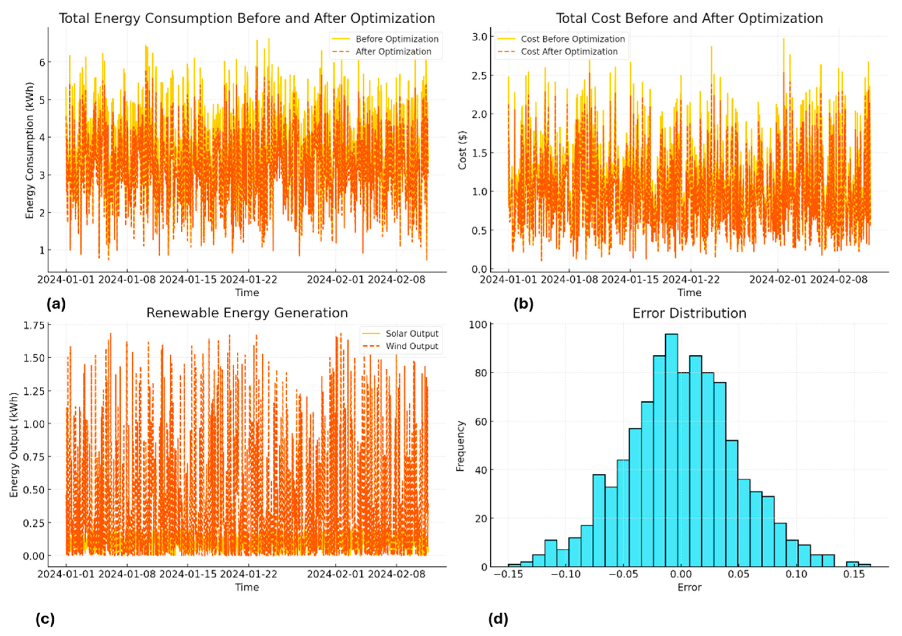 Figure 5 shows the implications of improving energy efficiency in smart structures. The top-left panel illustrates how energy consumption is reduced after optimization, while the top-right panel demonstrates the corresponding decrease in energy costs. The bottom-left panel shows renewable energy generation from solar and wind resources, highlighting their contributions to the system. The bottom-right panel presents the error distribution of the proposed model, centered closely around zero, which confirms the accuracy and reliability of the predictions. The reduction is directly attributed to smart scheduling, efficient appliance operation, and renewable energies adoption by the building’s power system. The system registered an average 10–20% reduction in power consumption, where sharpest reductions were registered in high-energy-consuming appliances, such as air conditioners and heaters, under load peaks. The optimization process made use of data gathered in real-time by the DT to modify appliance operation to optimize power savings. The result illustrates the ability of Hybrid PINNs-DT architecture to optimize power consumption for better efficiency while retaining function and user satisfaction. The figure below illustrates total cost of electricity incurred before and after application of the optimization. Due to electricity price variability, depending on demands and supplies, the optimization system effectively reduced costs by rescheduling the operation of high-energy-consuming appliances to periods of lower electricity pricing. The system registered average cost savings of 15–25% for observed time. Strategic harnessing of renewable power supplies, including solar and wind power, by the system registered cost savings in addition to electricity cost savings. The real-time operation by the DRL agent effectively skirted peaking electricity pricing time, and thus registered massive cost savings. The massive cost savings in