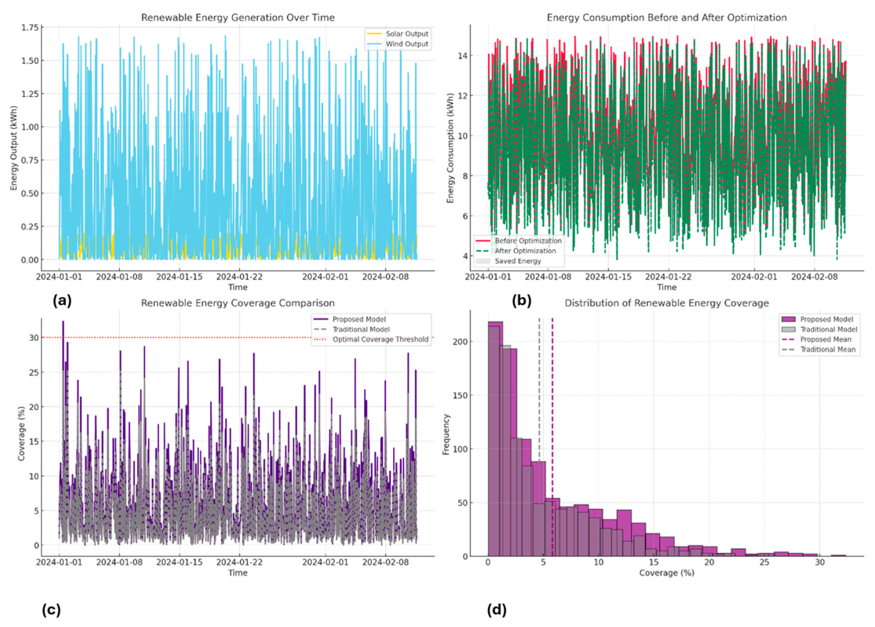 Traditional_Model_Coverage_%: This column provides the renewable energy coverage achieved by a traditional optimization model. The values are generally lower than those of the proposed model, highlighting the comparative inefficiency of traditional methods in maximizing renewable energy usage.
