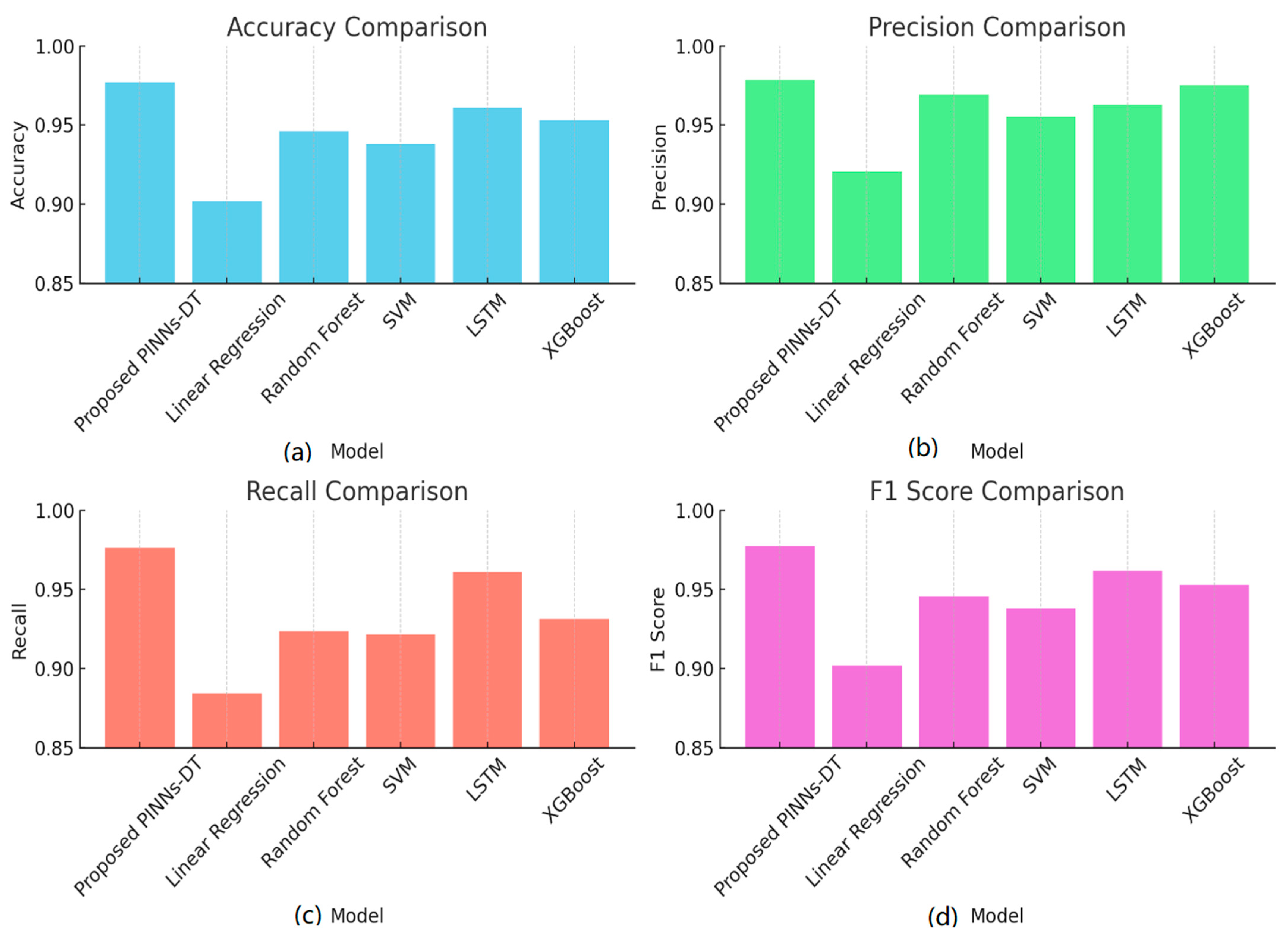 Figure 7 illustrates the comparative performance of the proposed PINNs-DT model against five well-known ML models: Linear Regression, Random Forest, SVM, LSTM, and XGBoost. The comparison is based on Accuracy, Precision, Recall, and F1 Score. The proposed PINNs-DT model outperforms all the other models in all the metrics with the best precision and recall, indicating its reliability and strength in accurately predicting the energy consumption patterns in smart grids.