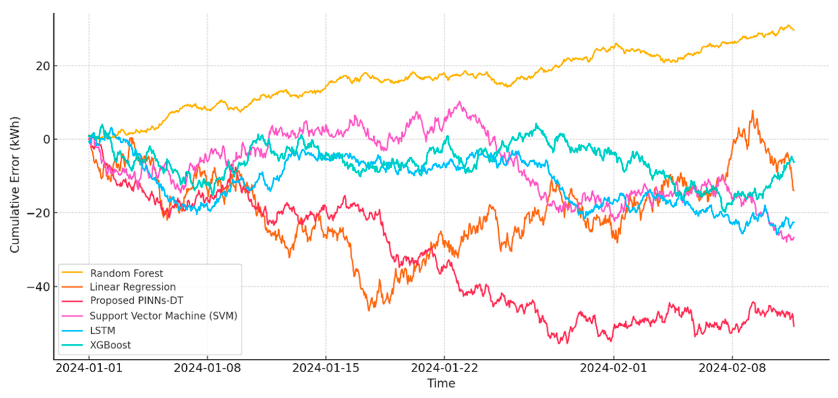 Figure 8 indicates the cumulative error in energy consumption predictions with time for the proposed PINNs-DT model and five other models: Linear Regression, Random Forest, SVM, LSTM, and XGBoost. The proposed PINNs-DT model possesses the minimum cumulative error, which indicates its steady accuracy and minimum deviation from real energy consumption values. Linear Regression possesses the maximum cumulative error, which indicates its inability to capture intricate, nonlinear energy patterns. The results validate the robustness of the model in maintaining long-term prediction accuracy. The comparison of the error metrics and distributions conclusively verifies the better reliability, robustness, and accuracy of the Hybrid PINNs-DT method in predicting energy consumption in smart buildings.