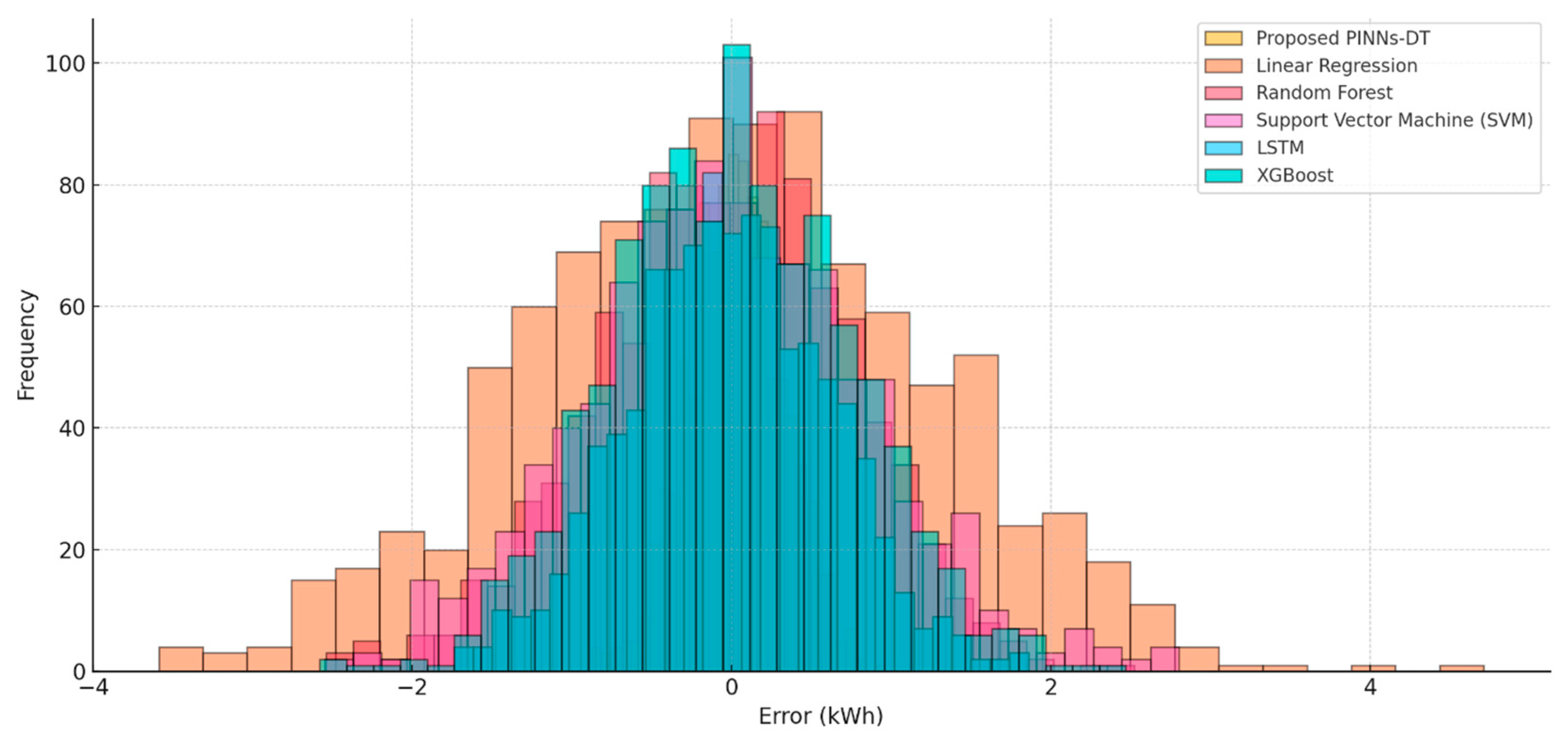 Figure 9 illustrates the distribution of the prediction errors of the proposed PINNs-DT framework and five other models: Linear Regression, Random Forest, SVM, LSTM, and XGBoost. The proposed PINNs-DT model’s errors are tightly bunched around zero, an indication of high predictive accuracy and dependability. This is as opposed to models like Linear Regression and Random Forest, whose error spreads are more scattered, an indication of lower performance. The tight error distribution of the proposed model is an indication of its ability to make accurate and dependable energy consumption predictions.