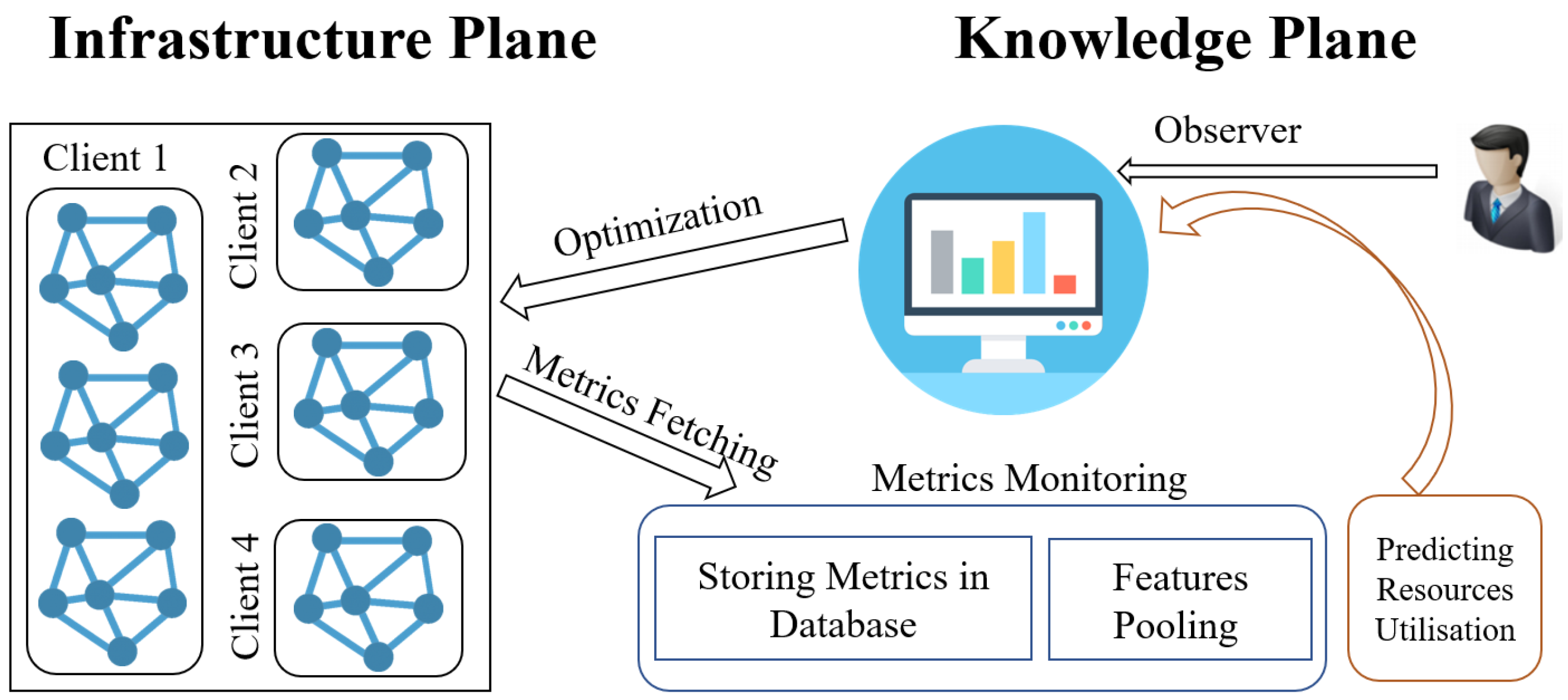The knowledge plane acts as the intelligence hub, storing network and sensor data and conducting comprehensive analyses using integrated machine learning models such as SLR, LSTM, and K-Means clustering. These analyses support well-informed decision-making, proactive alerting for anomalies or incidents, and maintain high availability of all core services. The knowledge plane is further enhanced by a data analytics tool facilitating data-driven decisions and alerting based on predefined thresholds. Additionally, a data visualiser provides network administrators with insightful representations, streamlining efforts towards optimising network resources and overall service quality within multi-tenant MSP operations.