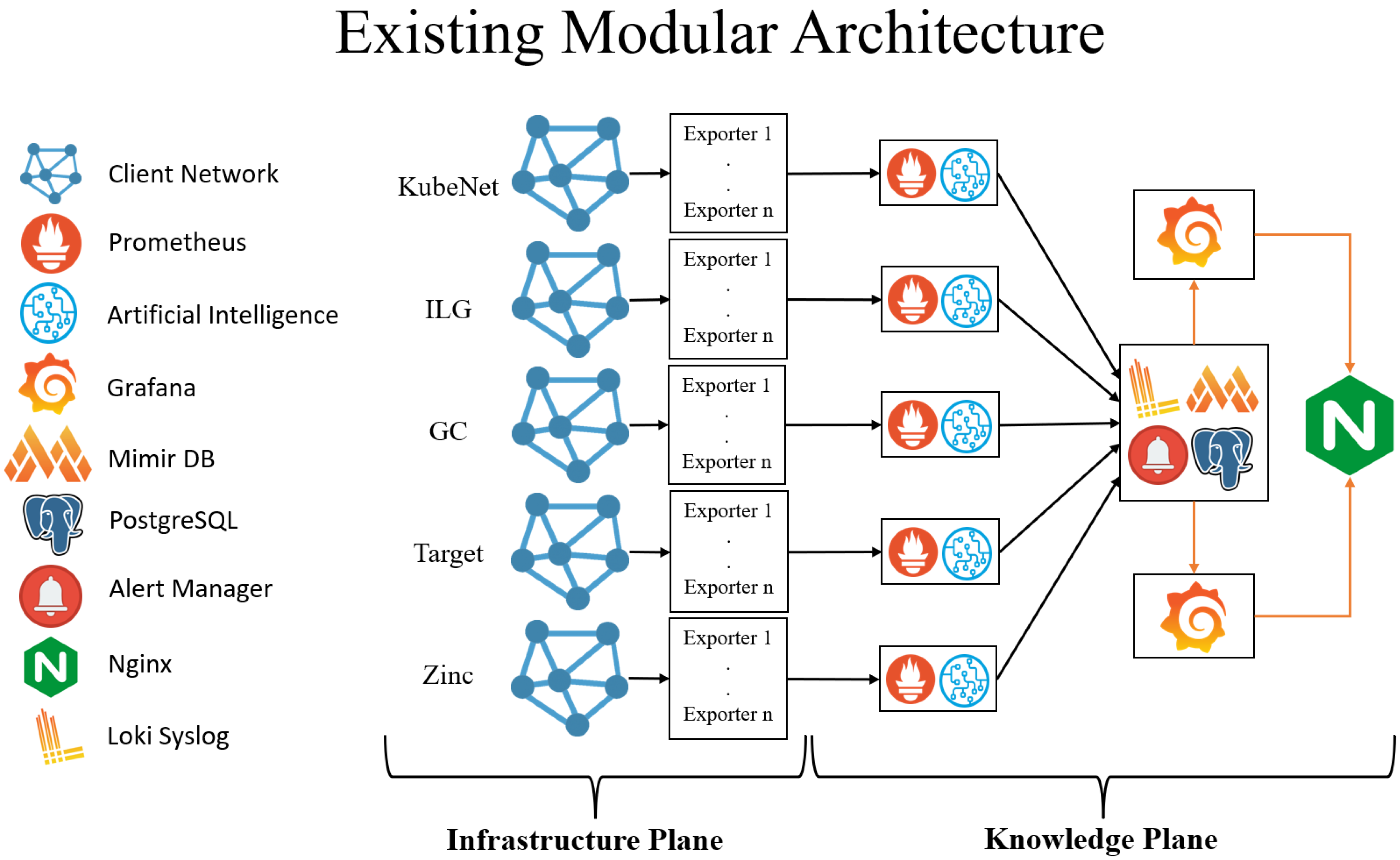 In the proposed decentralised AI- and IoT-driven monitoring architecture for multi-tenant networks, influenced by the work of [13], we have outlined two fundamental components as illustrated in Figure 1: the infrastructure plane and the knowledge plane. The infrastructure plane encompasses the multi-tenant networks consisting of geographically distributed client environments. The knowledge plane includes essential elements such as data observation, analysis, alerting systems, AI modules, and Docker Swarm for orchestration. This modular architectural design supports scalable and secure monitoring and visualisation across diverse client networks.