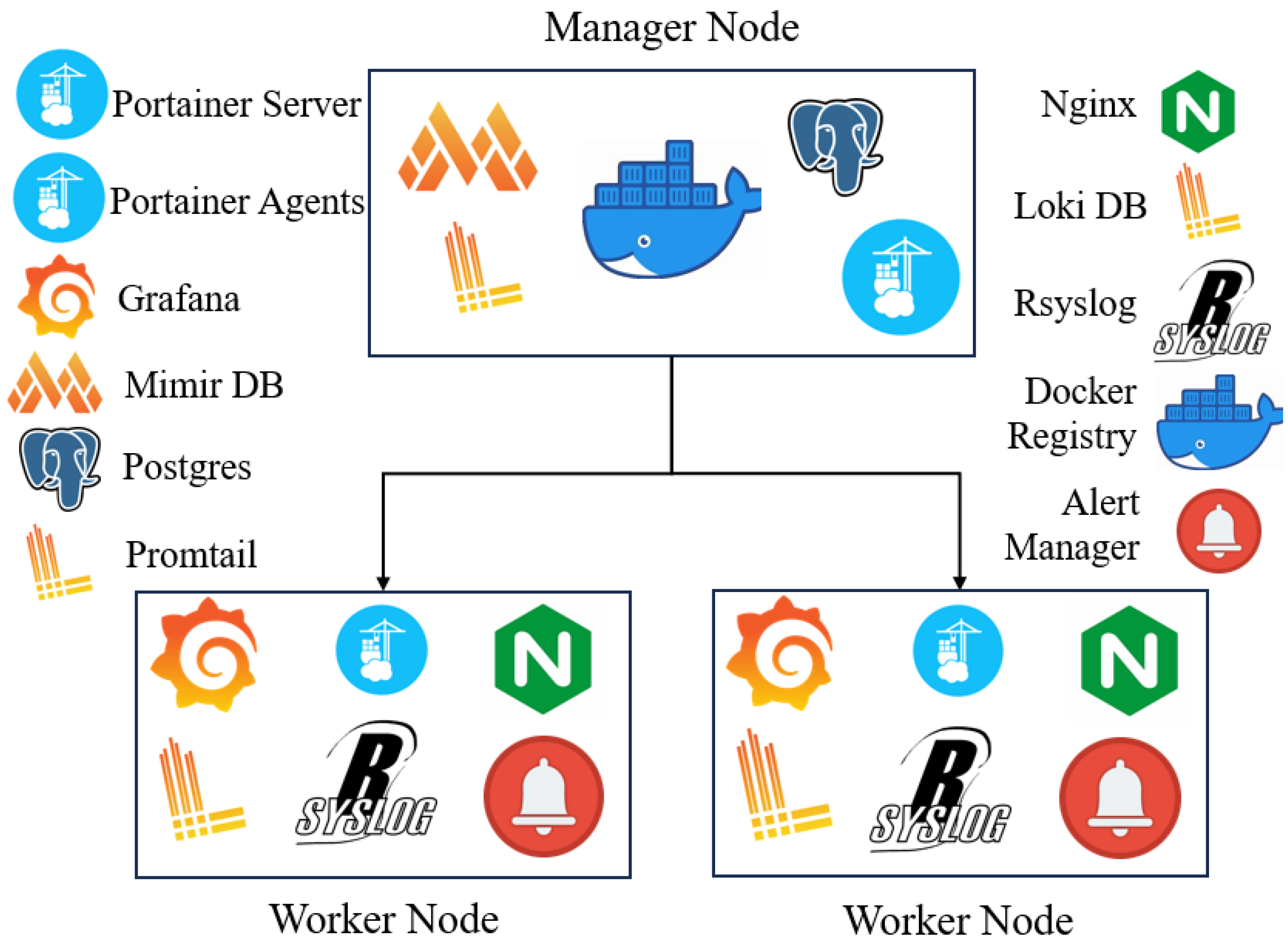 Worker Nodes host two Grafana instances deployed across separate nodes, each integrated with Grafana Mimir to enable comprehensive data visualisation tailored to client-specific multi-tenant requirements. Additionally, two Loki Promtail instances collect and forward logs to Grafana Loki, while two Alert Manager instances operate redundantly for robust alert delivery. All Prometheus servers send alerts to Alert Manager, triggering timely notifications. Enhancing security and access performance, two Nginx proxy instances balance and secure connections to Grafana. Two Rsyslog instances on worker nodes aggregate system logs, interfacing closely with Loki Promtail. Lastly, two Portainer agents facilitate Docker API request proxying and response aggregation across the cluster.