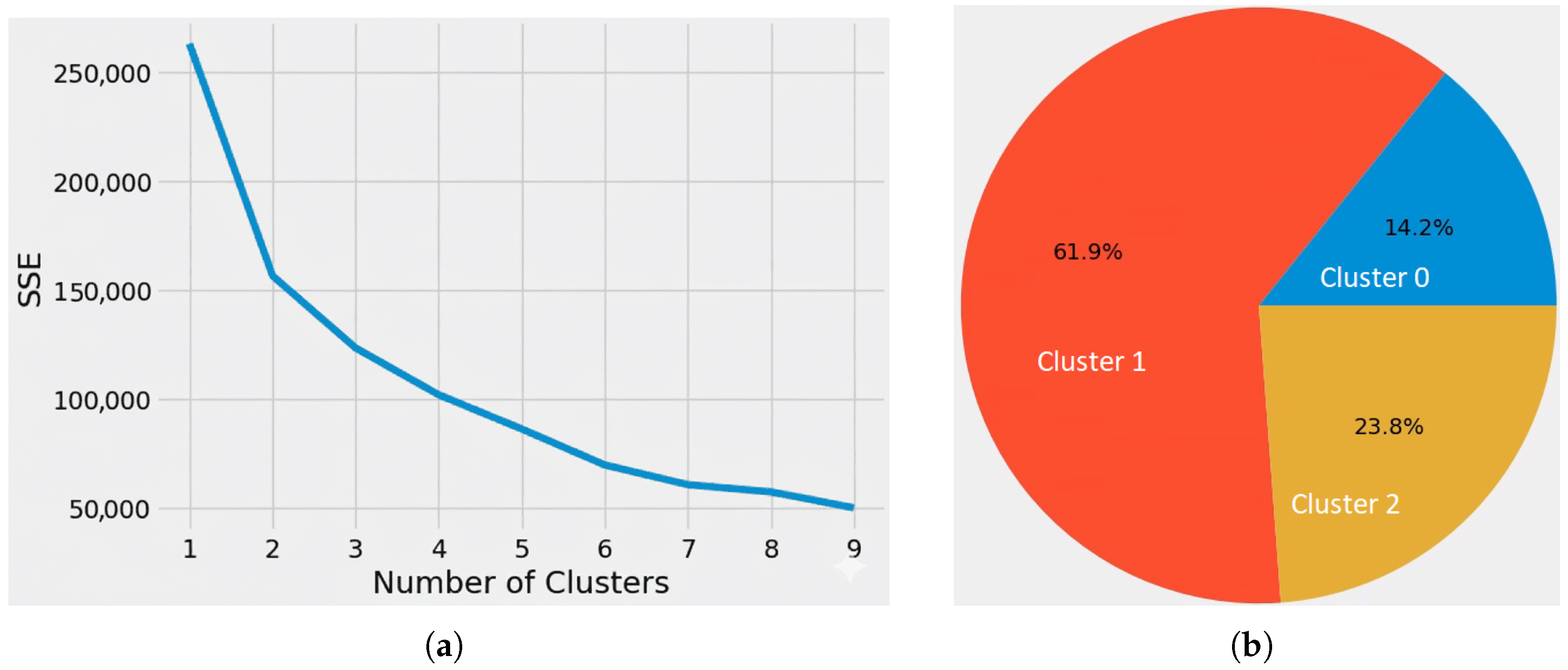 Figure 4. K-Means Clustering performance analysis. (a). Optimal solution for finding the number of clusters in the dataset. (b). Pie-chart showing the distribution of cluster lengths.
