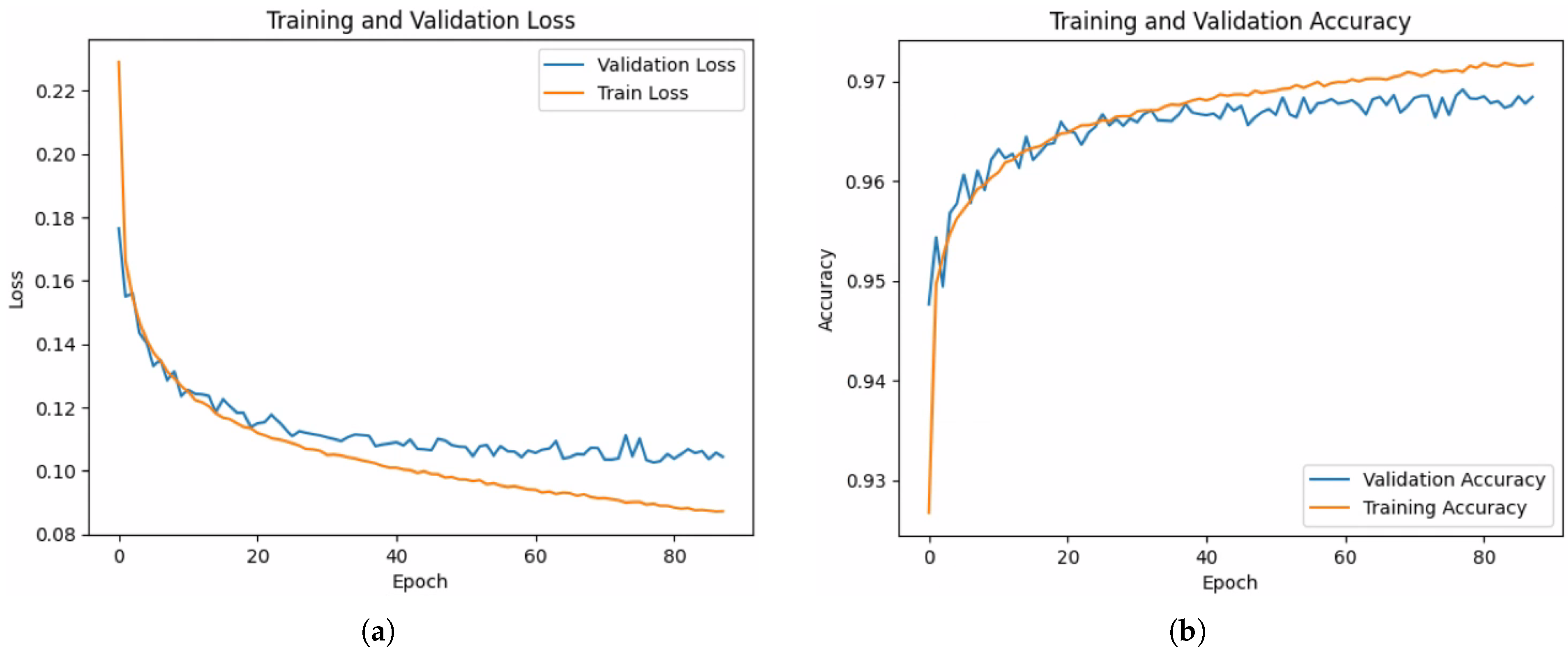 Figure 5. LSTM performance analysis. (a). Line graph showing training and validation loss. (b). Line graph showing training and validation accuracy.