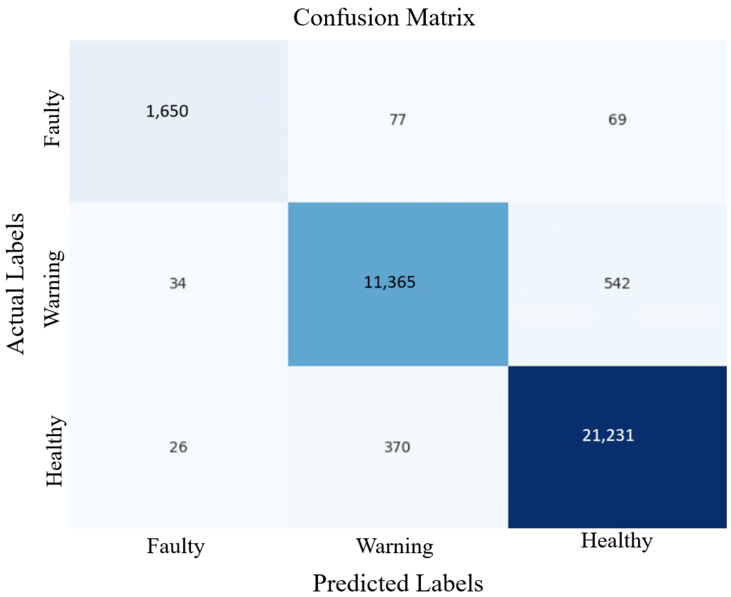• Label creation: Healthy/Warning/Fault states were generated by threshold-based rules validated against service-desk tickets. Labels were defined as follows: Fault if (CPU > 95% OR Memory > 95% OR Storage > 95%), Warning if (50% < CPU ≤ 95% OR Memory 50–95%), and Healthy otherwise. Where service-desk tickets existed for the same time window, labels were cross-validated and corrected manually.