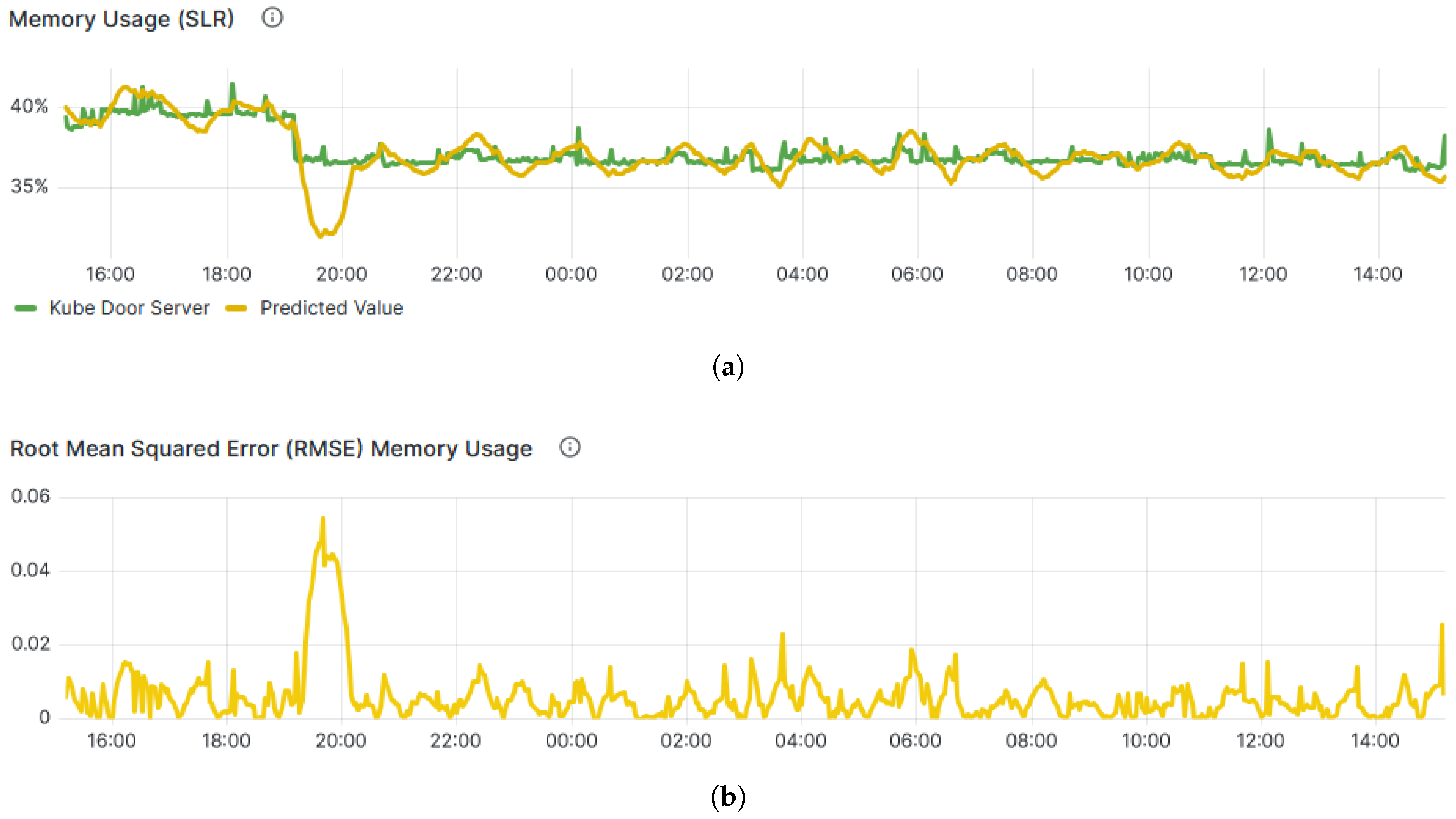 Figure 7. SLR performance analysis. (a). Line graph showing actual and predicted memory usage. (b). Line graph showing the RMSE values in predicting memory usage.