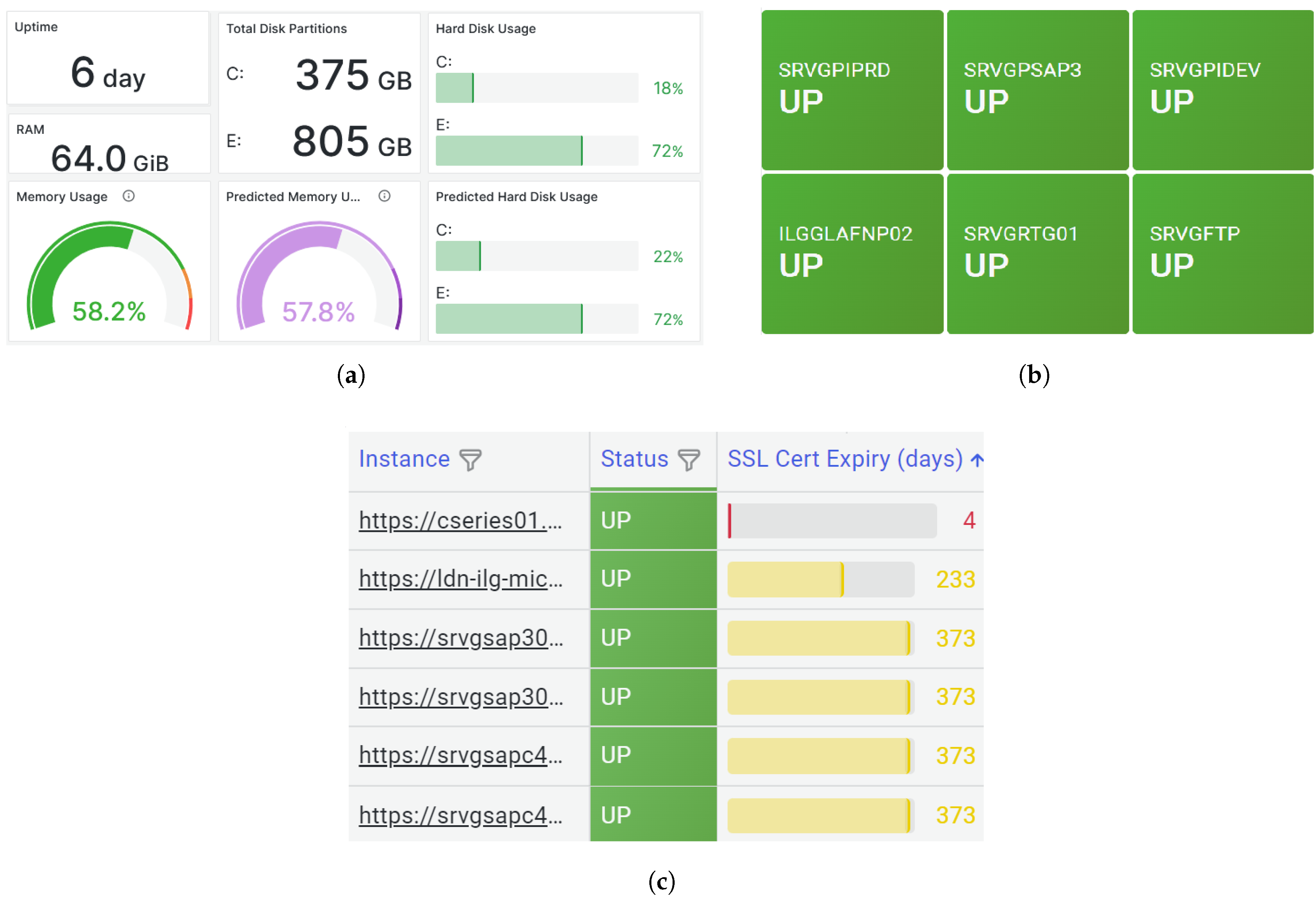 Figure 8. Snapshot of panels from the multiple dashboards. (a). Windows system with predicted metrics. (b). Current status of system connectivity. (c). Current status of websites.