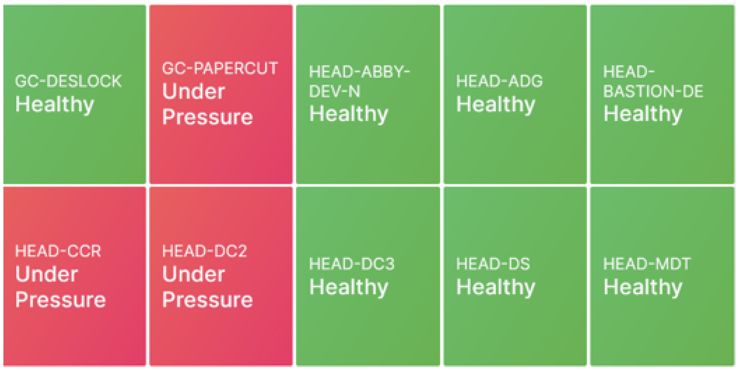 Figure 9. Snapshot from the dashboard showing the predicted system health status. Where green indicates a healthy network state, orange signals a warning, and red highlights critical faults.