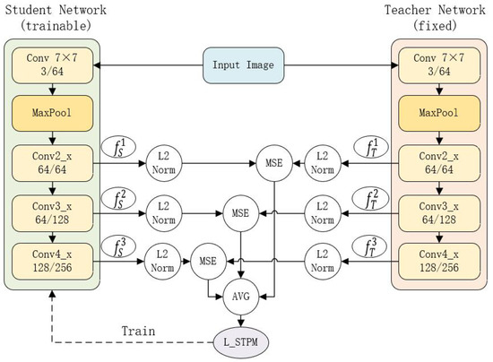 UAD approaches have primarily evolved along two main branches. The first consists of reconstruction-based methods, utilizing models like Autoencoders and GANs to learn the normal data manifold [9,10,11]. The second and often more powerful branch involves feature embedding-based methods. These techniques map normal samples into a compact feature space using pretrained networks, one-class classification, or memory banks [12,13,14,15,16]. Within this latter category, Student–Teacher Feature Pyramid Matching (STPM) has emerged as a state-of-the-art technique [17,18]. STPM leverages knowledge distillation, where a pretrained teacher network provides descriptive features for normal samples, and a student network learns to match these features. Anomalies are then detected by significant discrepancies between the student’s and teacher’s feature representations [17].