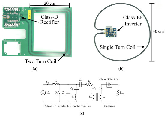Inductive power transfer hardware: (a) receiver, (b) transmitter, and (c) simplified circuit of a Class EF-driven inductive power transfer system. This inverter is driven using the DC voltage input .