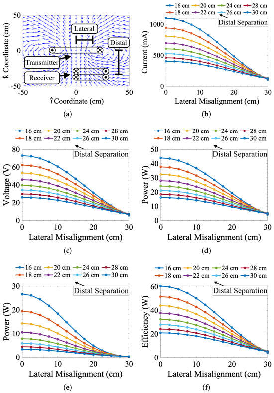 Simulated misalignment response data for 16 to 30 cm of distal separation and 0 to 30 cm of lateral misalignment. (a) Normalized vector plot of showing the location of the transmitter and receiver coils. (b) Transmitter current , (c) receiver voltage , (d) transmitted power , (e) received power , and (f) efficiency as functions of lateral (x-axis values) and distal (legend values) misalignment.