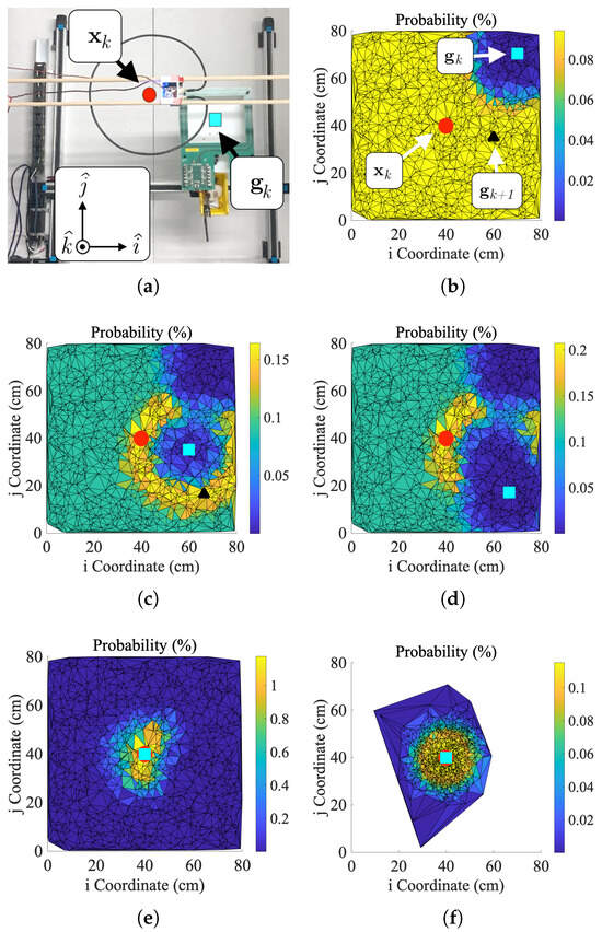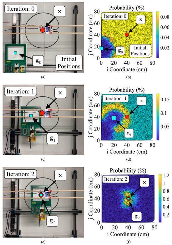 Sample data and images from a coil alignment test. Subfigures (a,b) show the test setup and probability map for an initially uncoupled test. Collectively, these figures represent iteration “zero” of the particle filter as the robot has not actually moved but has updated probabilities once. Subfigures (c,d) show data from iteration “one” of the test cycle. Similarly, subfigures (e,f) show data from iteration “two” of the test cycle, i.e., the final iteration. While initially uncoupled tests usually take more than three measurements to converge, this particular test cycle was simply lucky in its predictions of .