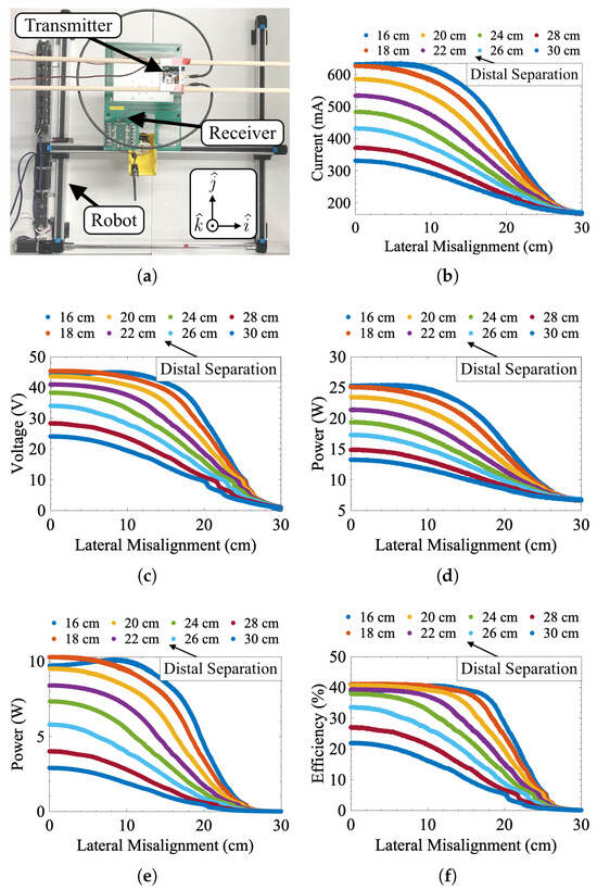 Measured misalignment response data. (a) Test setup with lateral ( and plane) and distal ( position) misalignment. (b) Transmitter current, (c) receiver voltage, (d) transmitted power, (e) received power, and (f) transmission efficiency as functions of lateral (x-axis values) and distal (legend values) misalignment.