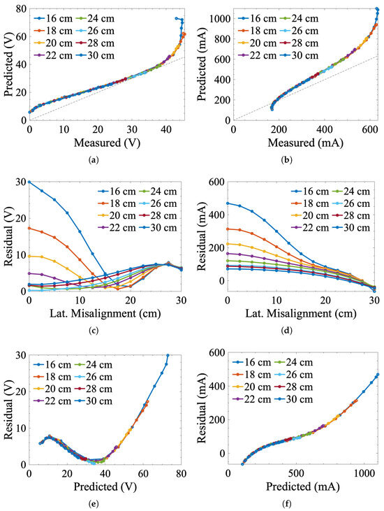 Error analysis of the theoretical model: (a) receiver voltage and (b) transmitter current measured vs. predicted plots for different values of distal separation. Note the gray line in these figures represents the line , i.e., the expected trendline for perfect correlation between measured and expected values. Subfigures (c–f) show the residual errors of for both control signals as functions of lateral misalignment and predicted output signals.